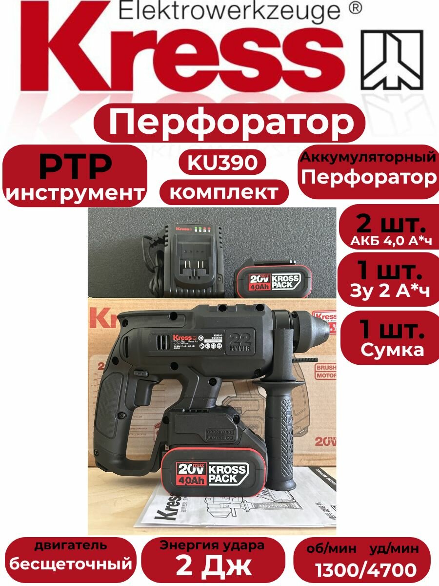 10 цен на Перфоратор KRESS KU390 бесщеточный аккумуляторный / Комплект: 2 АКБ 4 А*ч, 1 ЗУ 2 А, Сумка