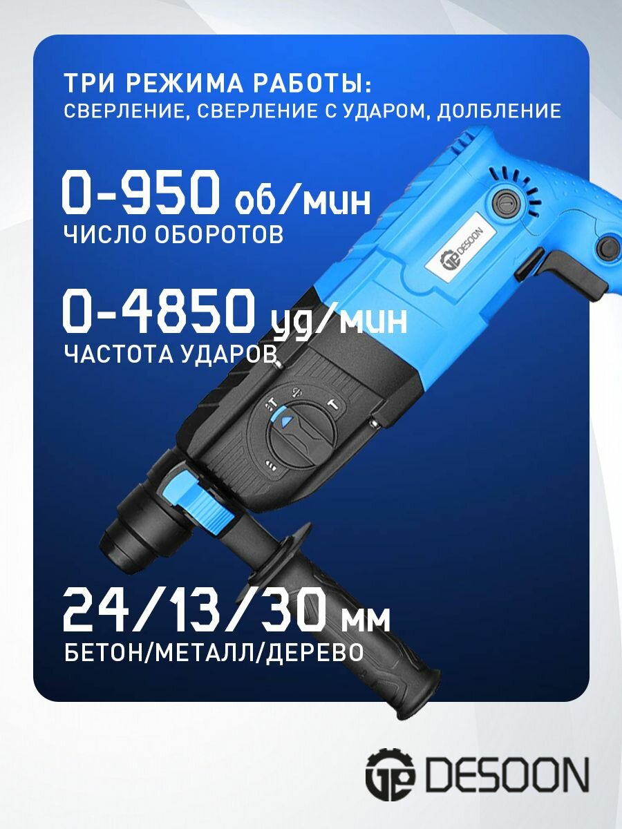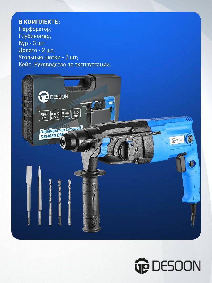Перфоратор сетевой DESOON DSH850 в кейсе с набором из 5 буров, 850Вт информация: