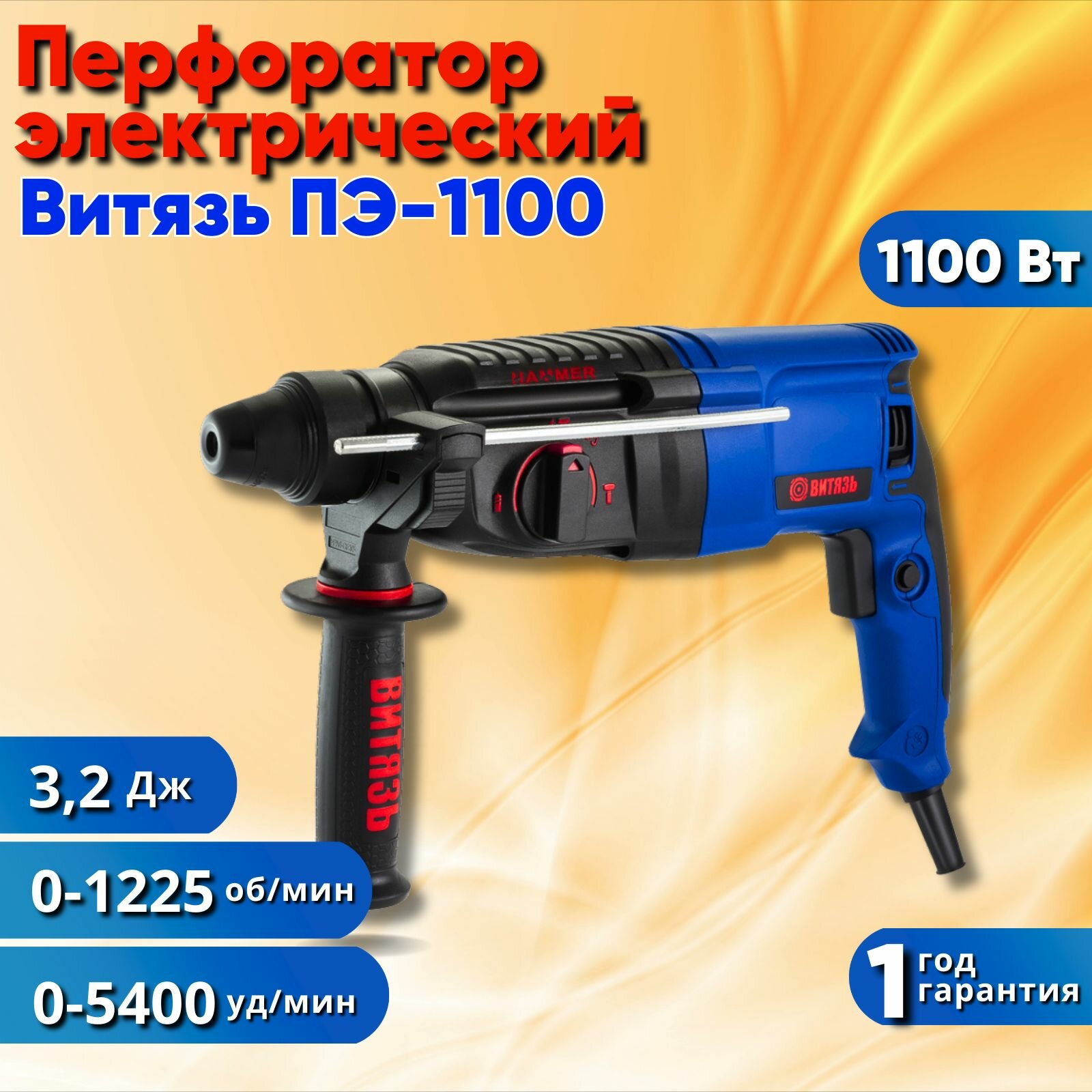 10 цен на Перфоратор электрический Витязь ПЭ-1100, 3.2 Дж, SDS +(Пика, Зубило, Дополнительный патрон, Адаптер, Кейс)