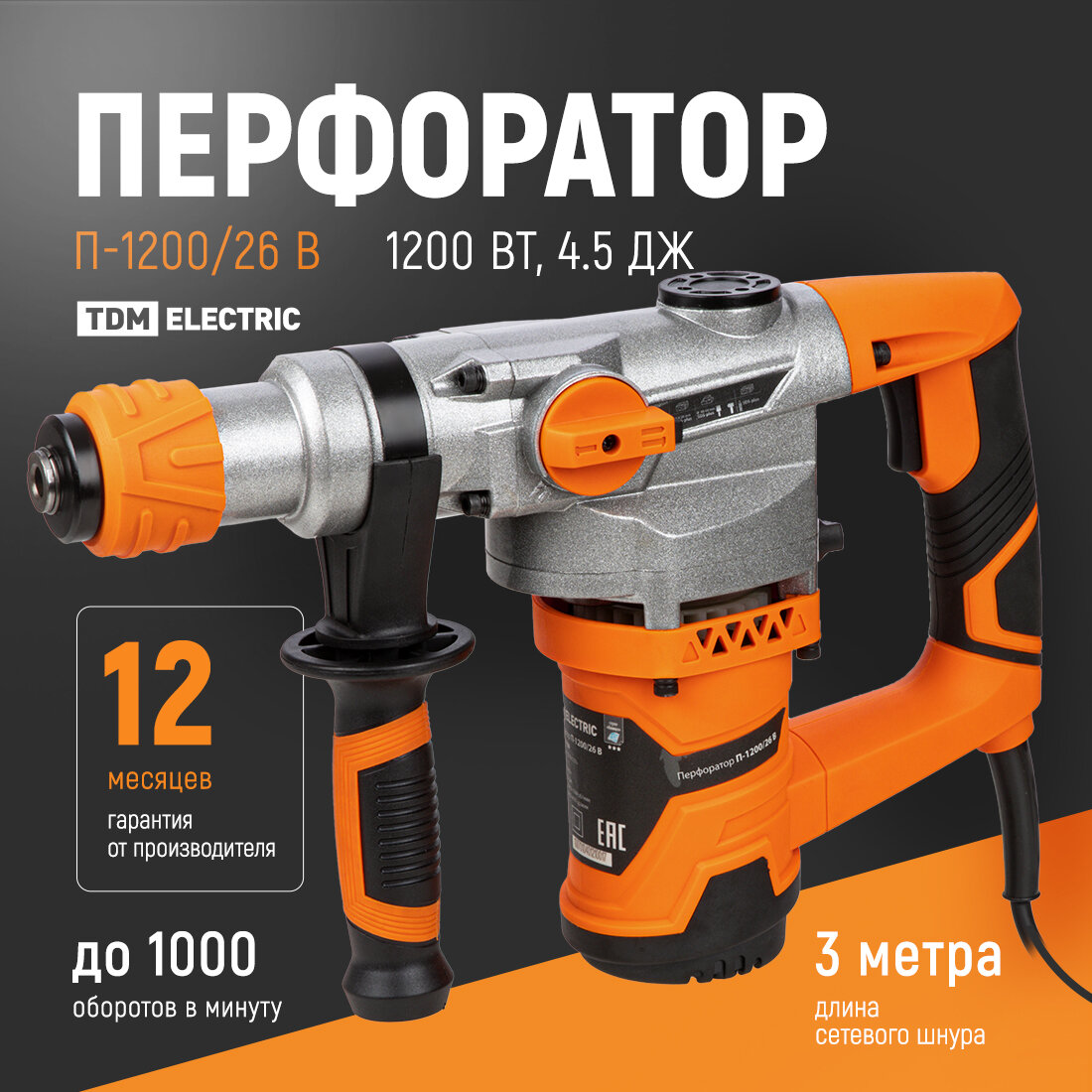 Перфоратор TDM Electric, электрический, 3 режима, с кейсом, макс. сила удара 4,5 Дж информация:
