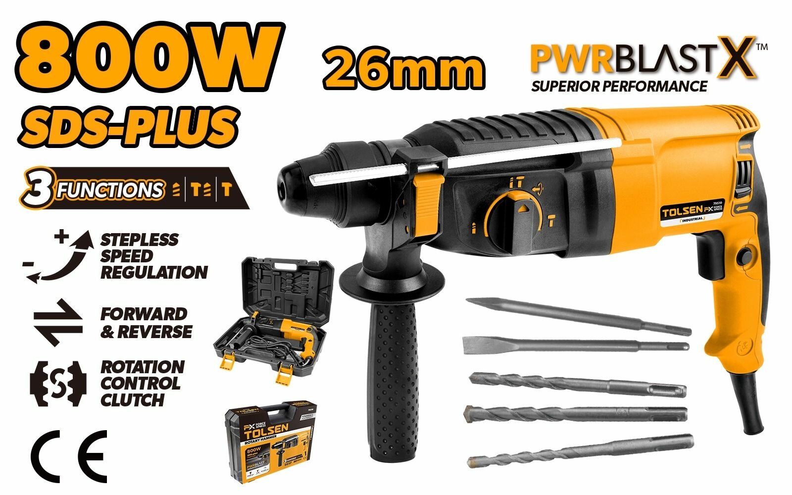 Перфоратор Tolsen, мощность 800Вт, патрон SDS-Plus, максимальная сила удара 2.8Дж информация: