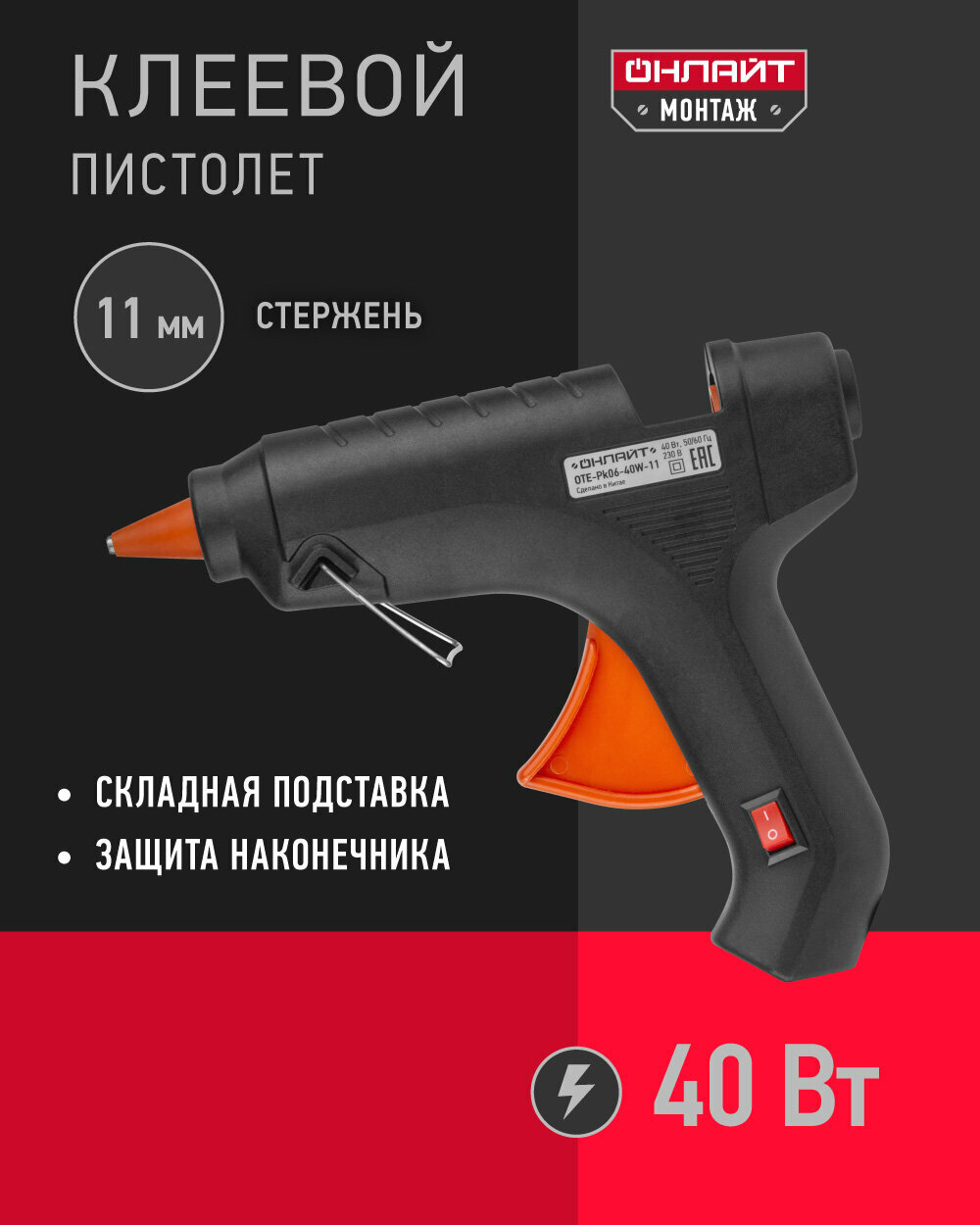 Клеевой пистолет для творчества онлайт 90 375, 40 Вт, 11 мм, черный информация: