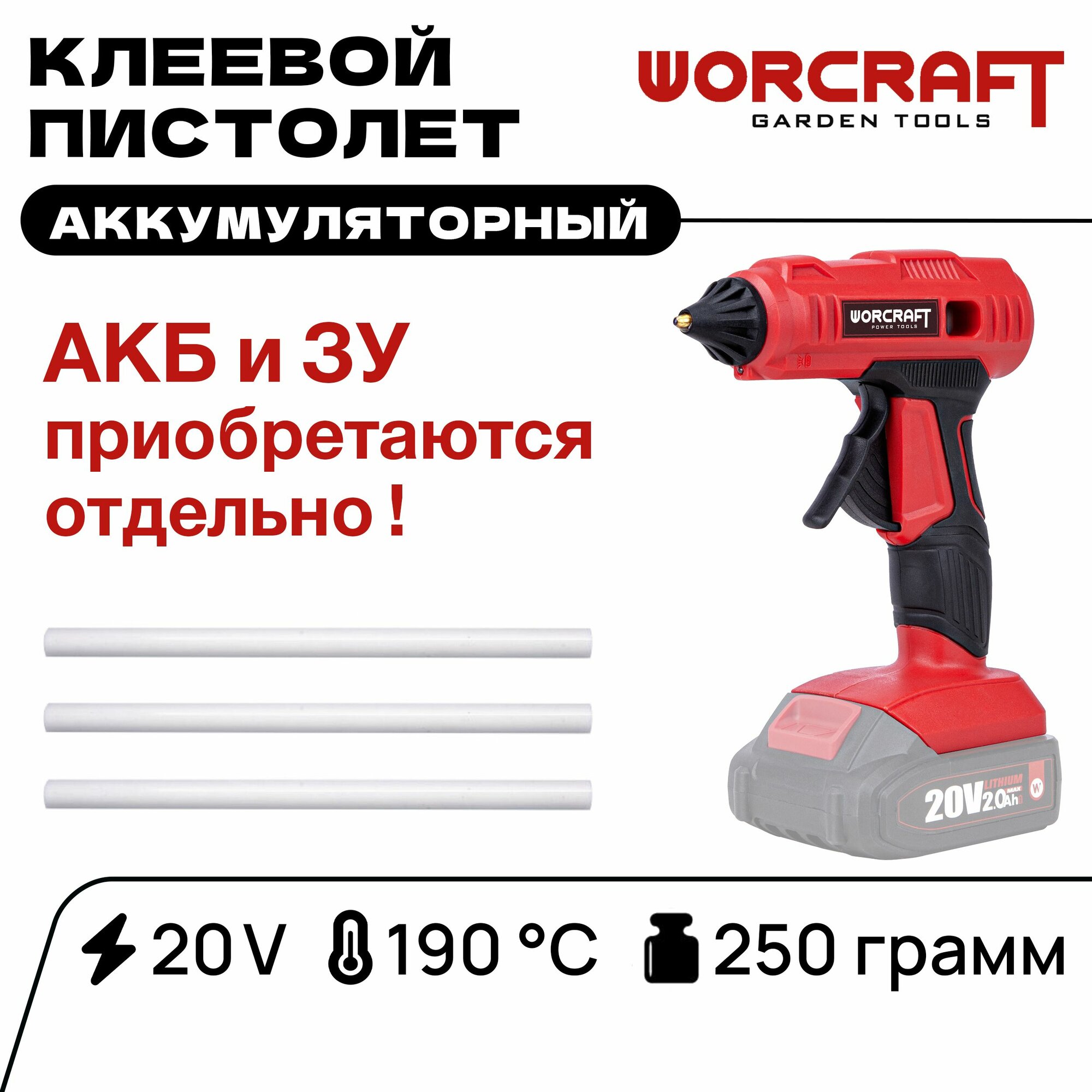 WORCRAFT Клеевой пистолет аккумуляторный 190 градусов 15 гр/мин и 3 стержня, Без АКБ и СЗУ. Термопистолет клеевой. информация: