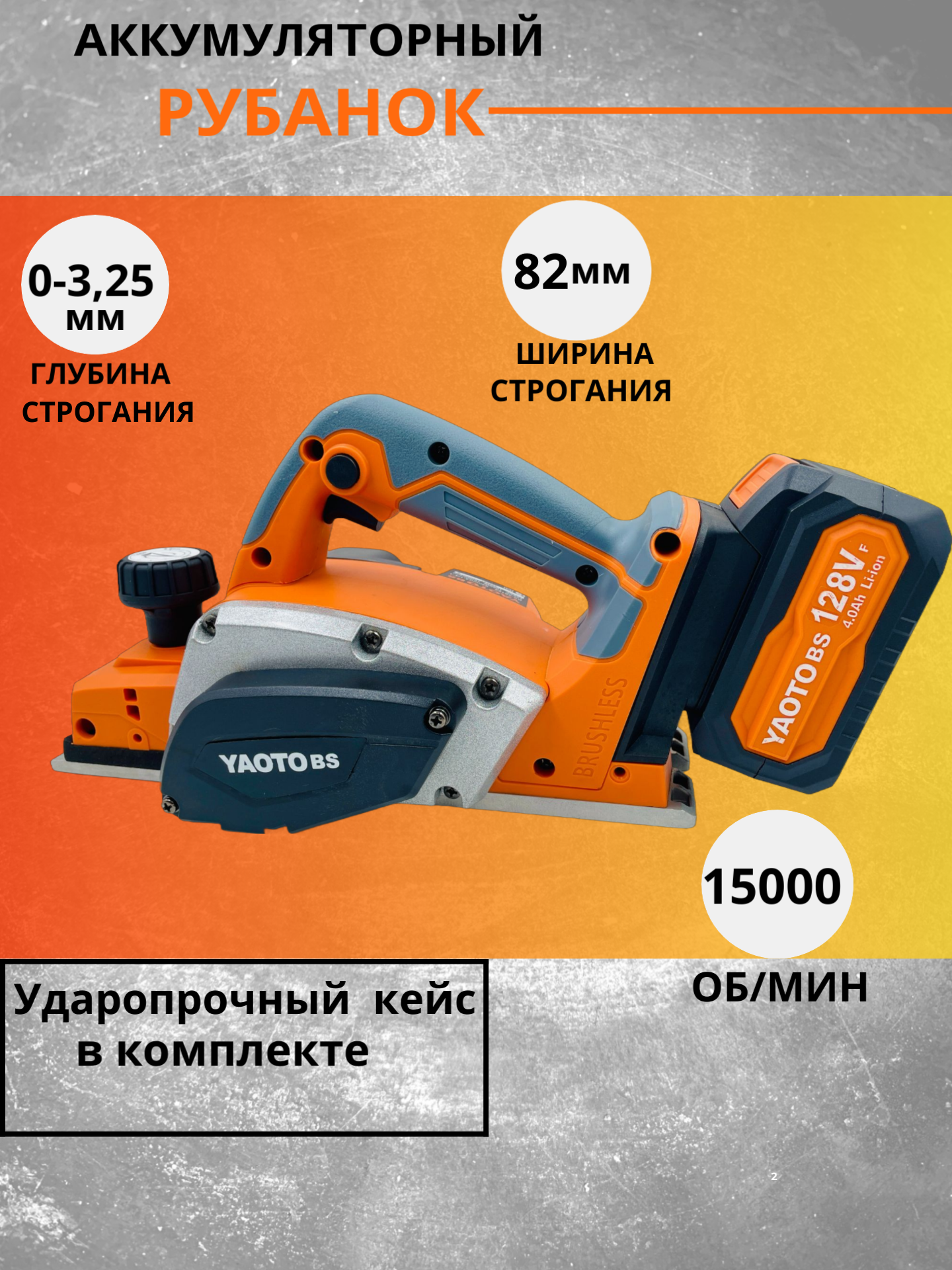 Аккумуляторный бесщеточный рубанок Yaoto BS 128VF с двумя аккумуляторами и кейсом информация: