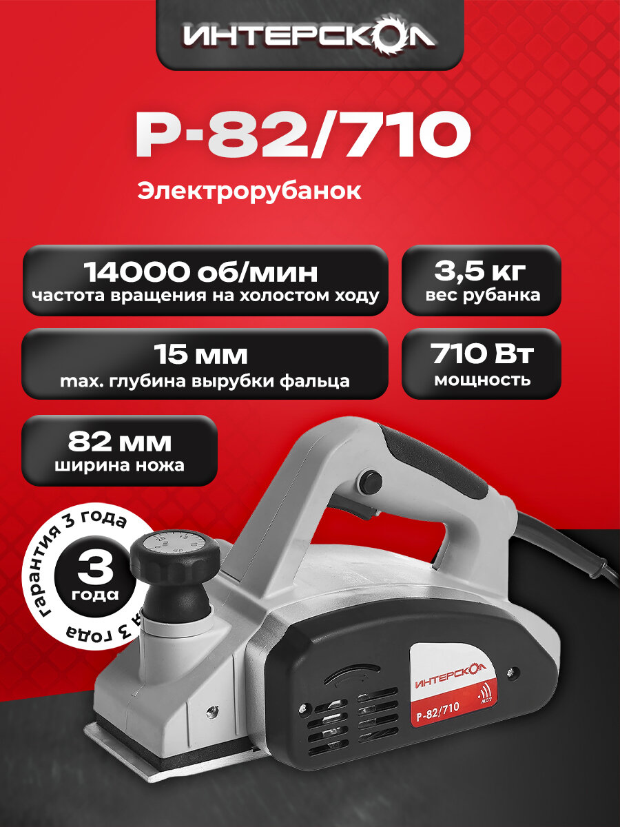 Электрорубанок ИНТЕРСКОЛ Р-82/710, 710 Вт, 14000 об/мин, 82 мм (50.1.0.12) информация: