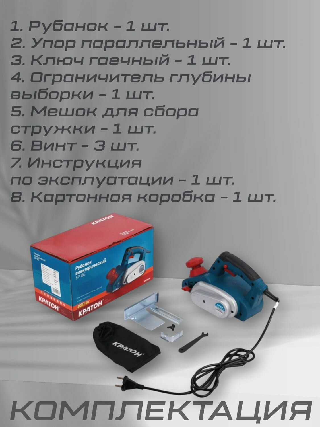 Рубанок электрический кратон EP-06, мощность 800Вт, 16000 об/мин, глубина/ширина строгания 0-3/82 мм, электрорубанок, сетевой рубанок информация:
