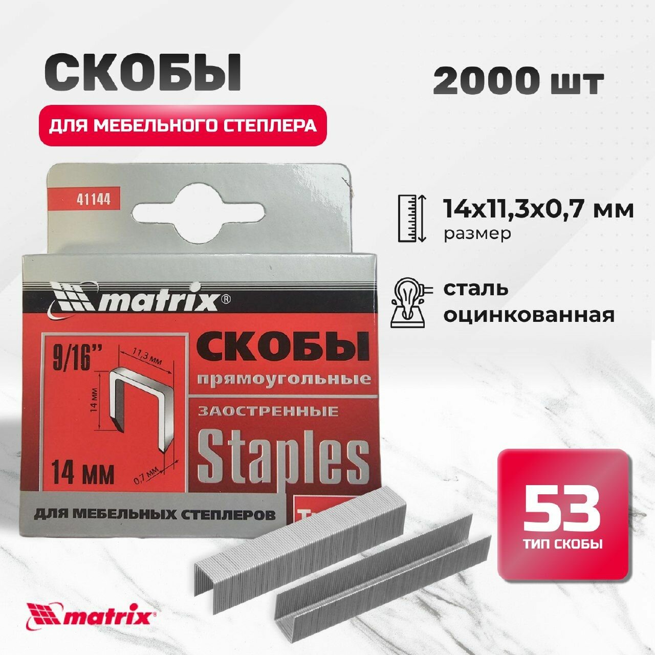 Скобы, 14 мм, для мебельного степлера, заостренные, тип 53, 2000 шт Matrix информация: