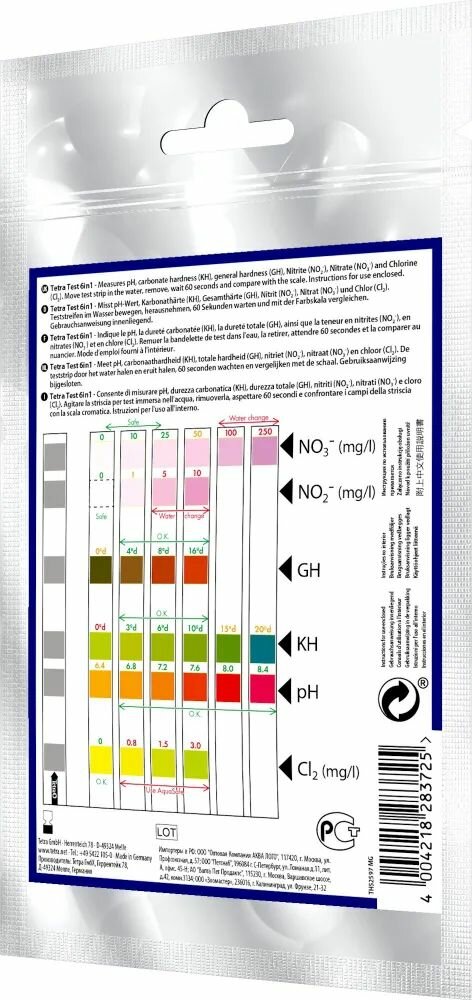 TETRA Тест 6 в 1 GH/kH/NO2/NO3/pH/CL2 полоски для пресной воды 10шт информация: