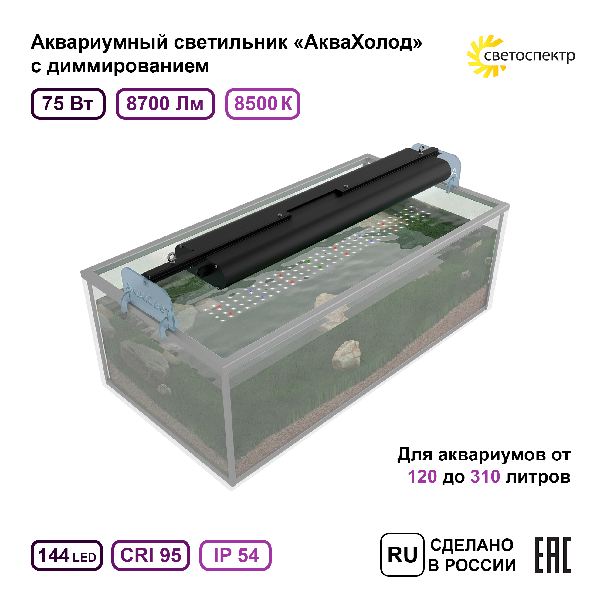 Светильник для аквариума АкваХолод 600 мм, 75Вт, 8500К с диммером информация: