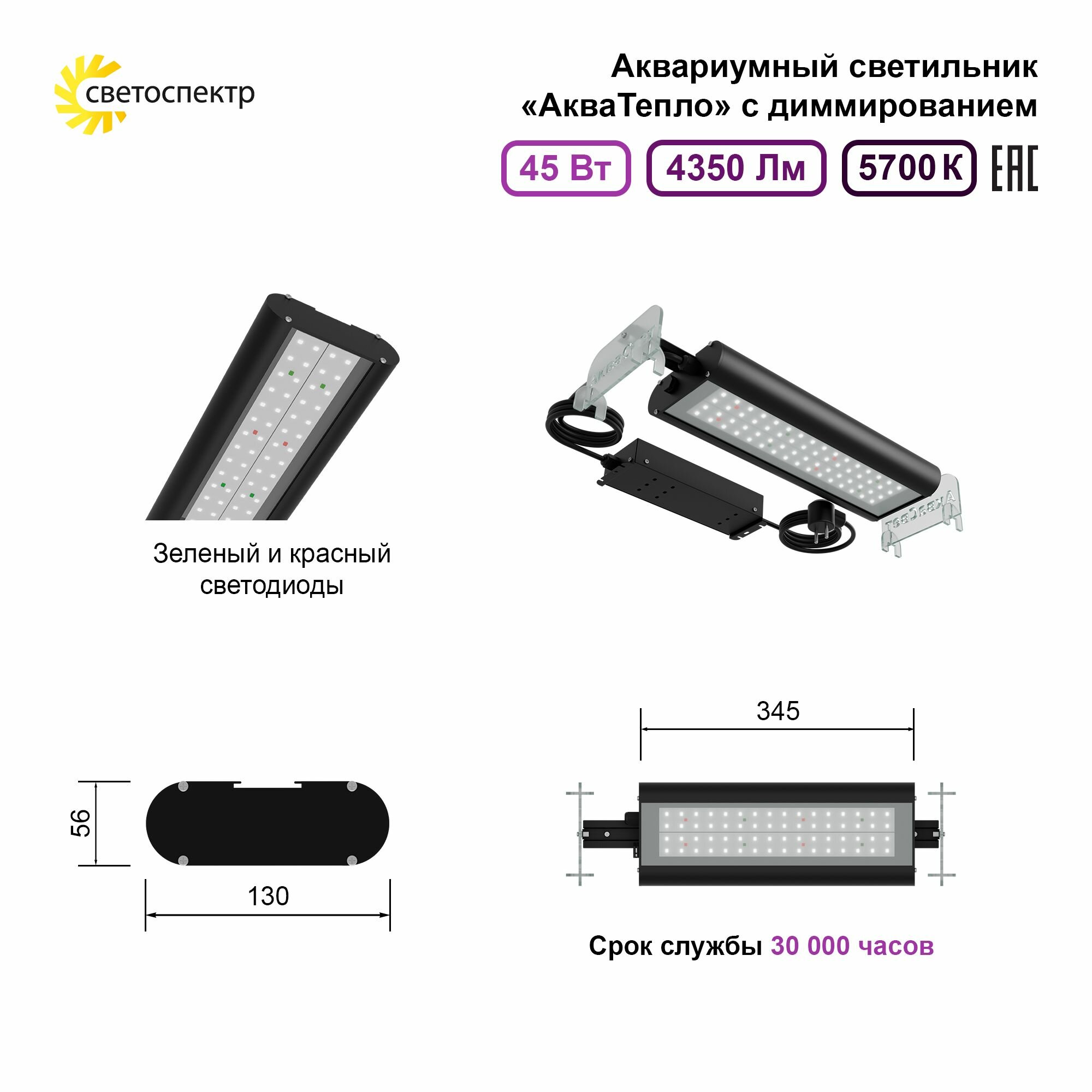 Светильник для аквариума "АкваТепло" 345 мм, 45Вт, 5700К с диммером информация: