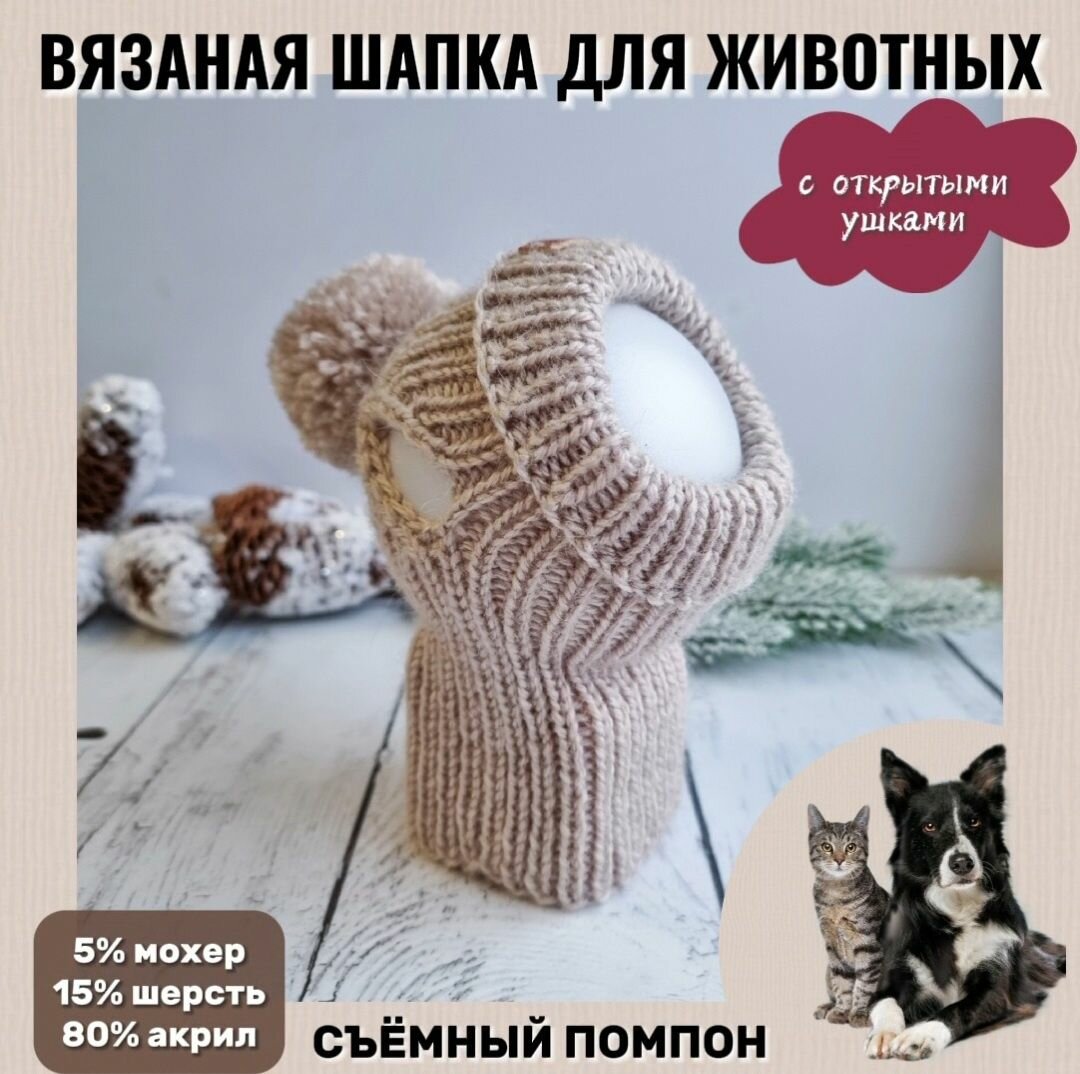 Вязаная шапка для животных с открытыми ушками, темный беж, М 1 200 ₽