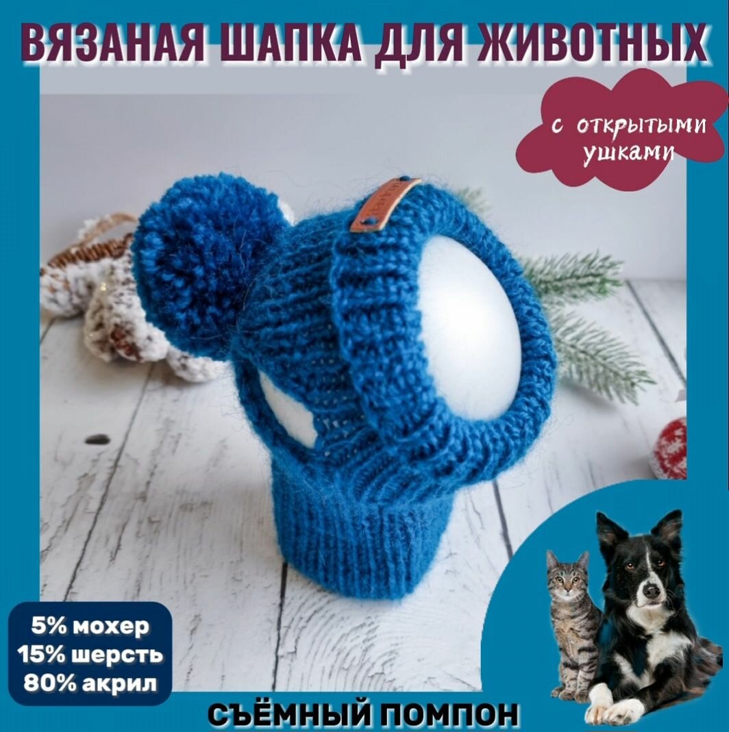 Вязаная шапка для животных с открытыми ушками, синий, М информация:
