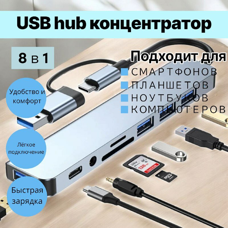 "AOCV USB Type C Hub" - 8-в-1 переходник для USB 3,0 и USB 2,0, USB/C, TF, AUDIO информация:
