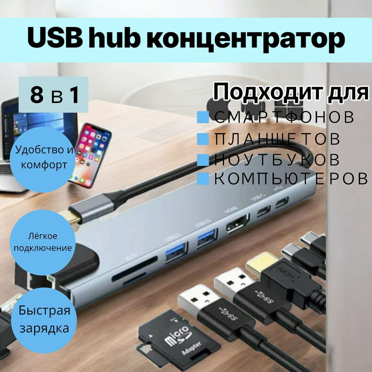10 цен на USB ХАБ 8 в 1 - концентратор AOCV с Type-c HDMI и RJ-45, 2хUSB3 и 2хType-c, SD, TF, PD