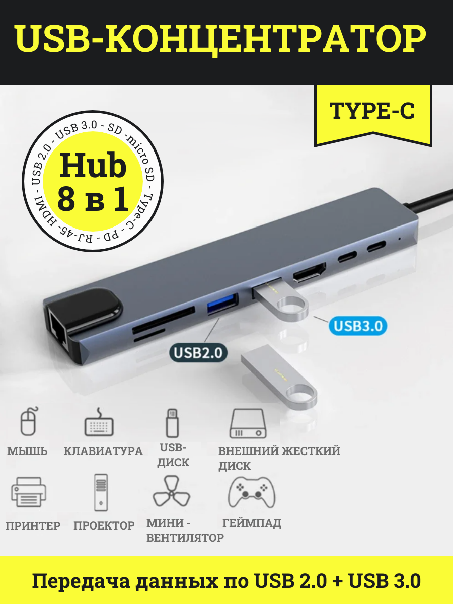 Хаб / USB-концентратор с Type-C HDMI | RJ-45 | 2xUSB 3.0 | 2xType-C | SD | TF | PD информация: