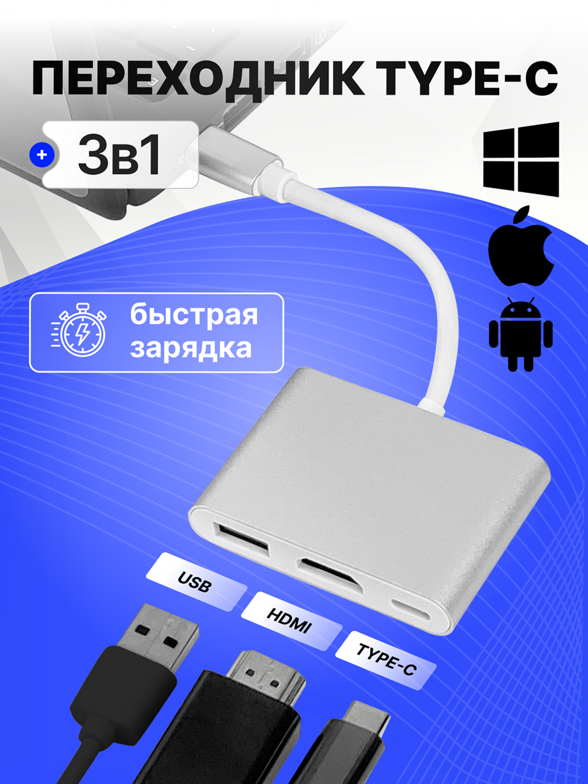 10 цен на Переходник - разветвитель USB HUB 3 в 1 Type-C, HDMI серебристый