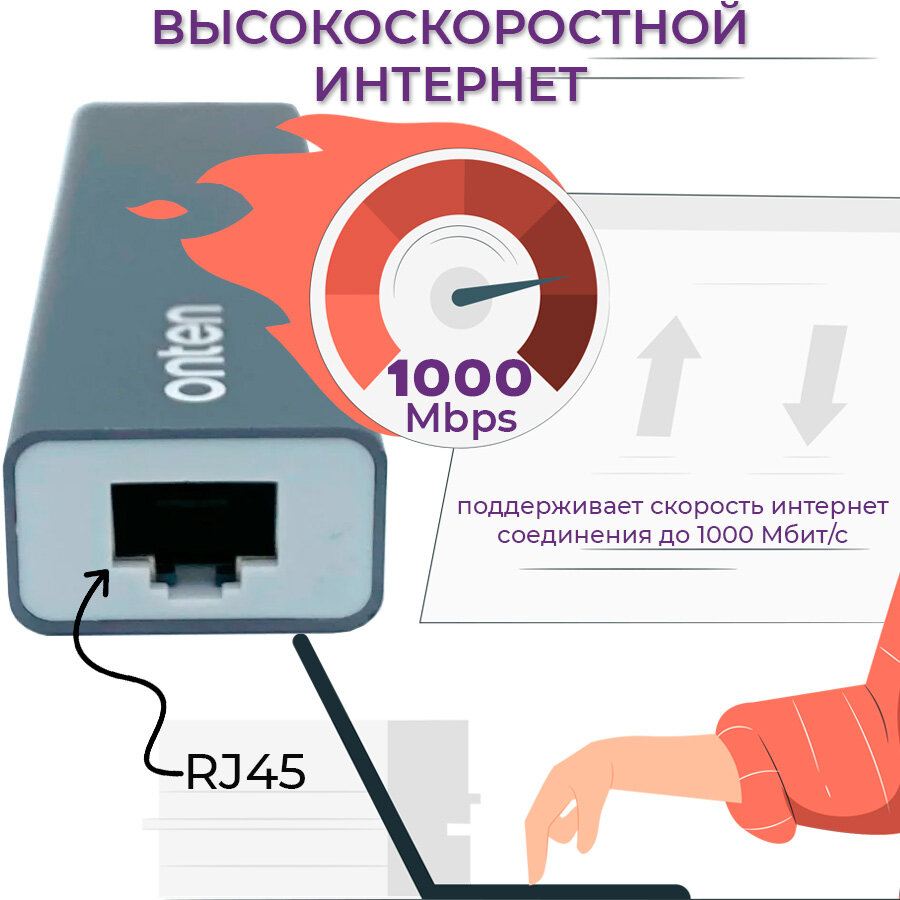 USB Type-C разветвитель хаб Onten на 4 порта 1xEthernet RJ45 , 3xUSB 3.0 для ноутбука, Macbook, ПК, смартфона информация: