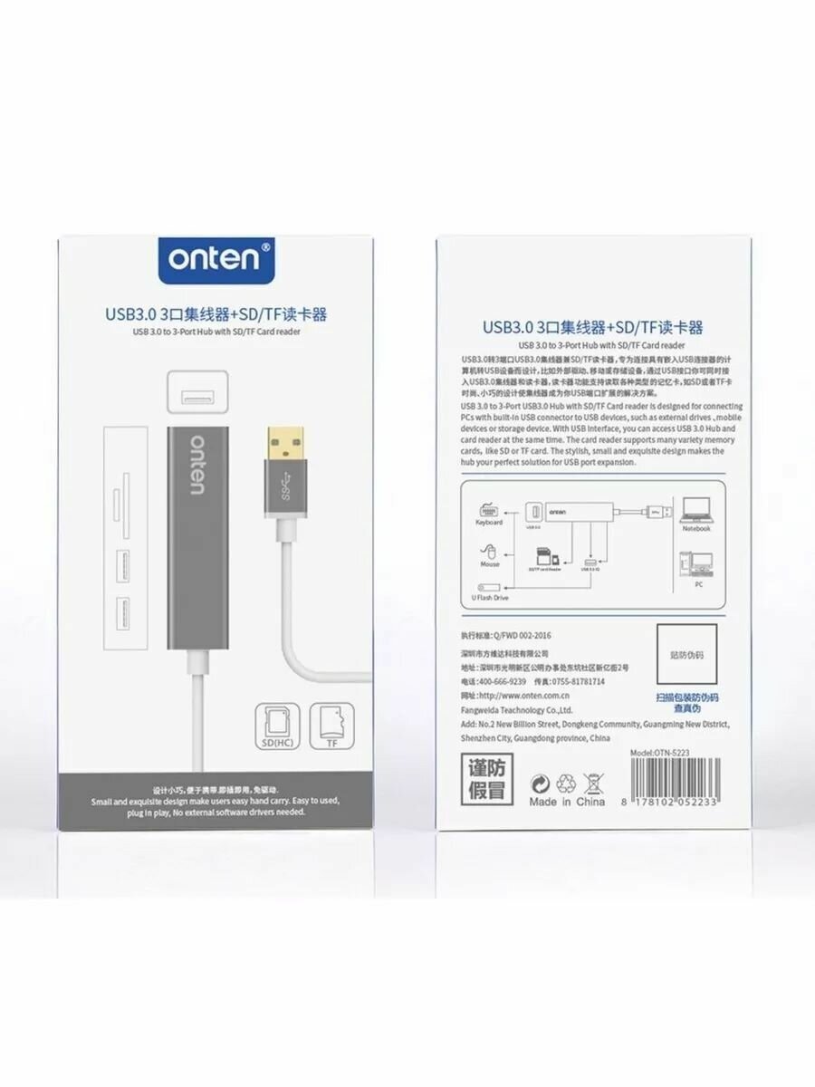 Разветвитель адаптер переходник USB 3.0 HUB Хаб картридер OTN-5223 5в1 3 порта+SD/TF серебро информация: