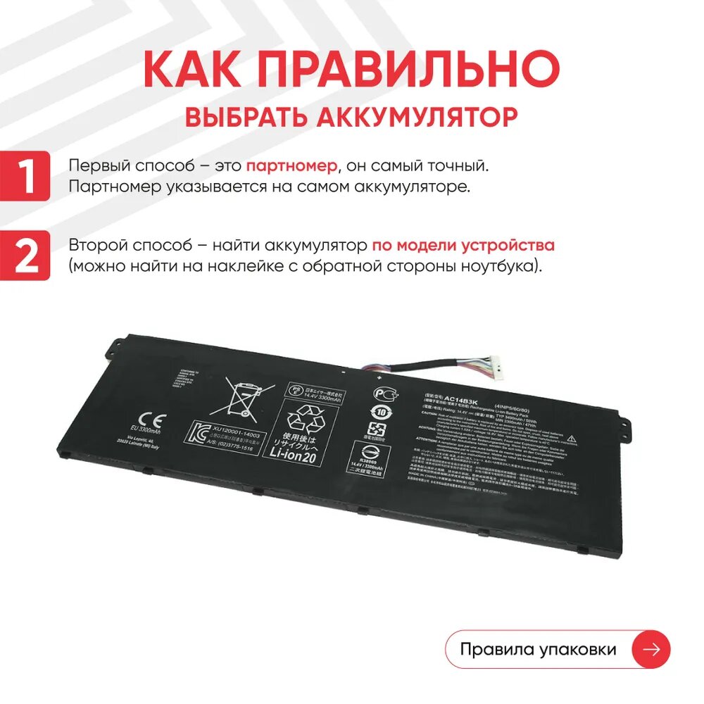 10 цен на Аккумуляторная батарея AC14B3K, 4INP5/60/80 для ноутбука Acer CB3-531 15.2В, 3300мАч, 48Вт