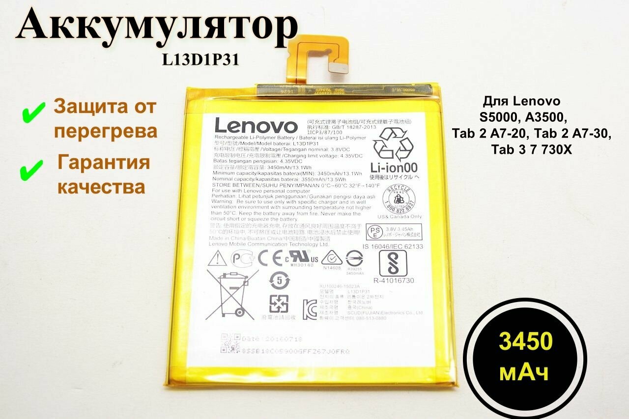 Аккумулятор для Lenovo S5000, A3500, Tab 2 A7-20, Tab 2 A7-30, Tab 3 7 730X (L13D1P3) информация: