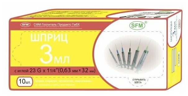 Шприц - 3мл. (3-х) SFM, однораз. стер. с надетой иглой 0,6 x 30 - 23G, упаковка №10