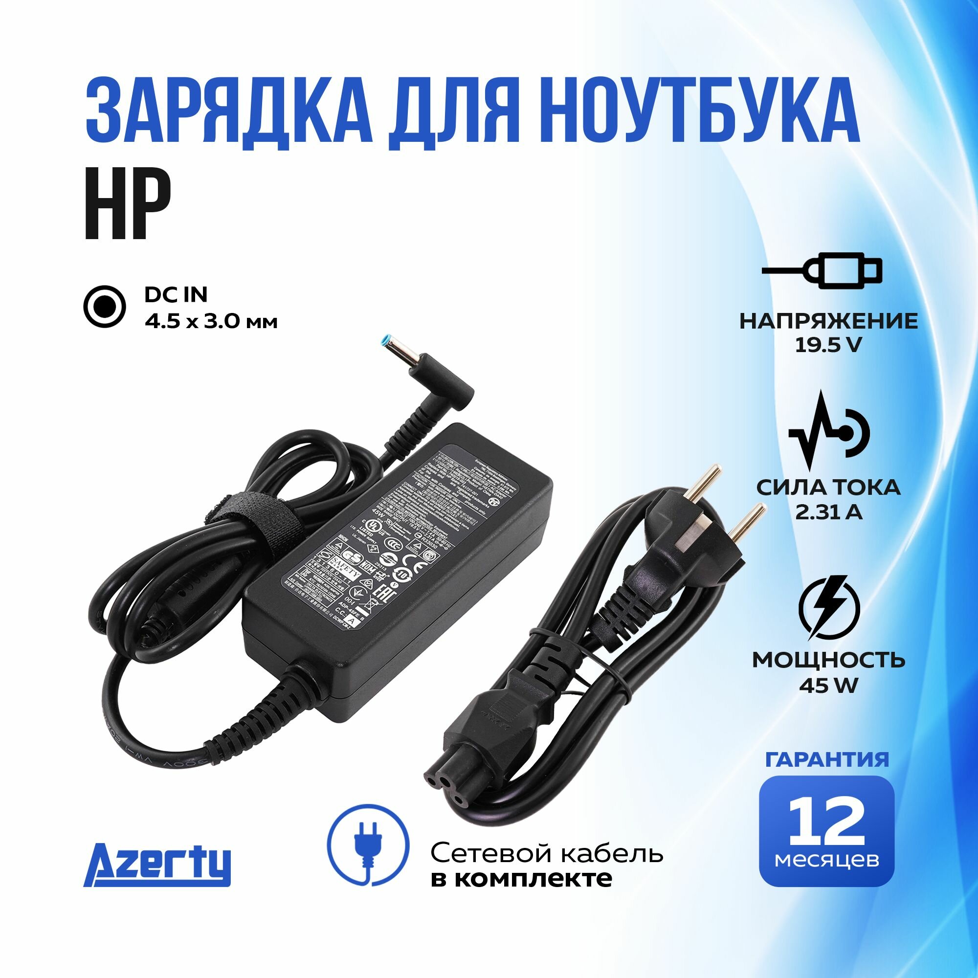 Зарядка для ноутбука HP 19.5 В 2.31 А (45 Вт) 4.5x3.0 мм с кабелем питания информация: