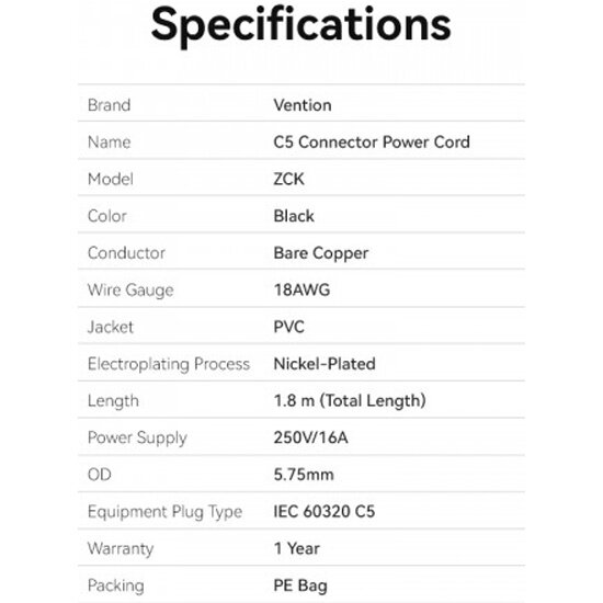Кабель питания Vention C5, угловая вилка - 1.8м. Чёрный информация: