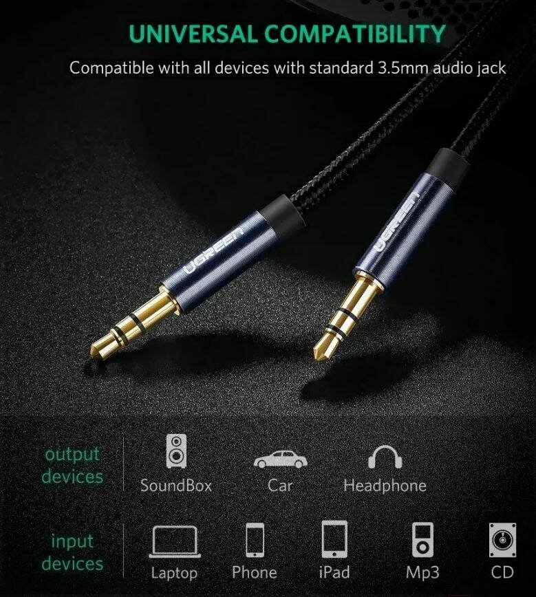 Отзывы на Кабель UGREEN AV112-10687 AUX 3.5mm (M) to AUX 3.5mm (M), позолоченные коннекторы, в нейлоновой оплётке, 2m, Blue