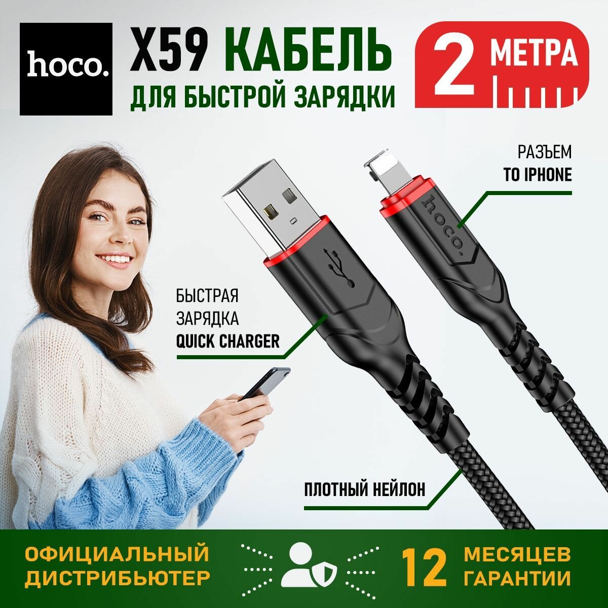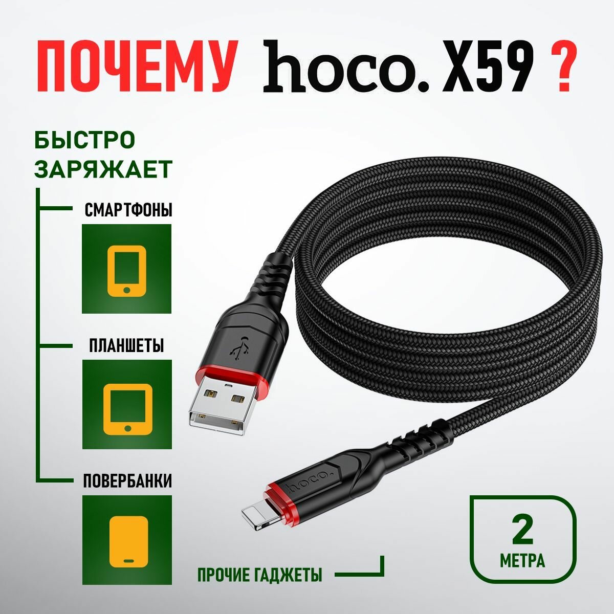 Отзывы на Кабель USB для lightning для быстрой зарядки hoco X59, 2 метра / Провод лайтинг хоко, кабель для зарядки для iPhone
