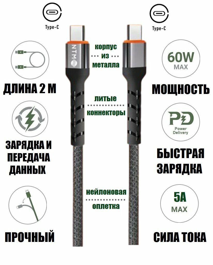 Кабель 2 м USB-С с быстрой зарядкой PD 60 Вт 5А нейлон информация: