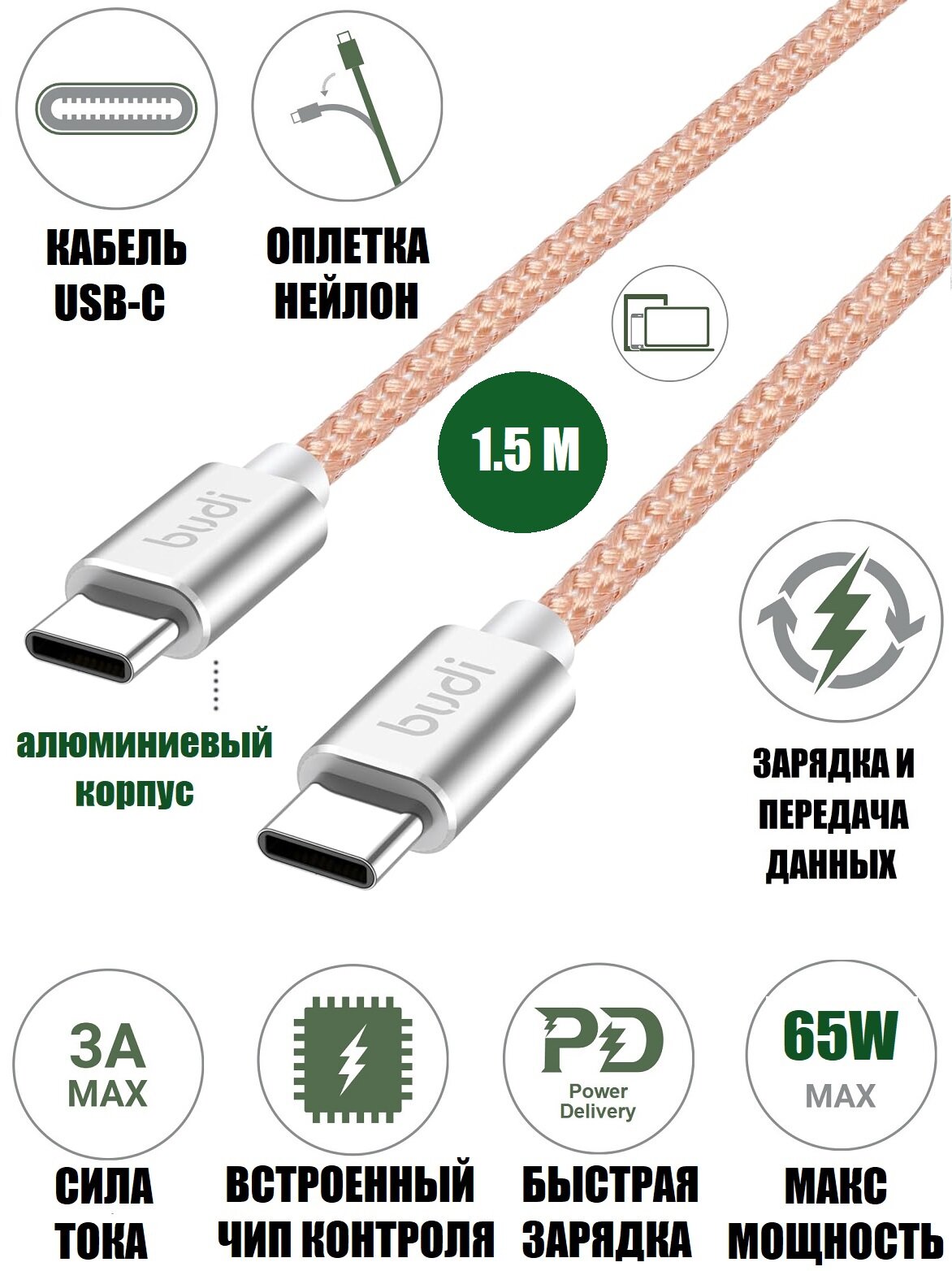 Кабель 1.5 м USB-С с быстрой зарядкой PD 65 Вт 3А нейлон коралловый информация: