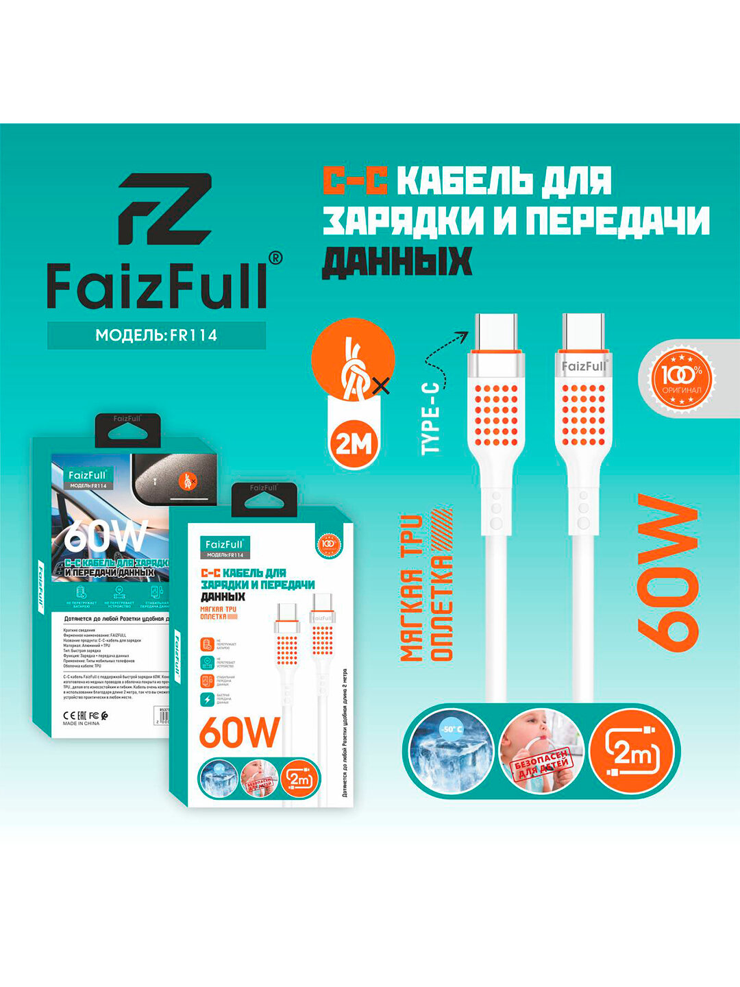 FaizFull Кабель для телефона FaizFull FR114 C-C (2м 60W) мягкий силикон, белый информация: