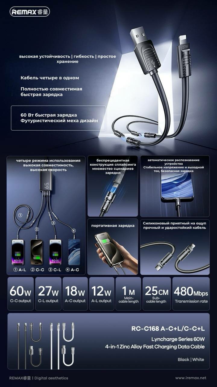 Кабель Type-C / Lightning / USB-A для быстрой зарядки iPhone / iPad / Android / iOS / Windows Remax 60Вт информация: