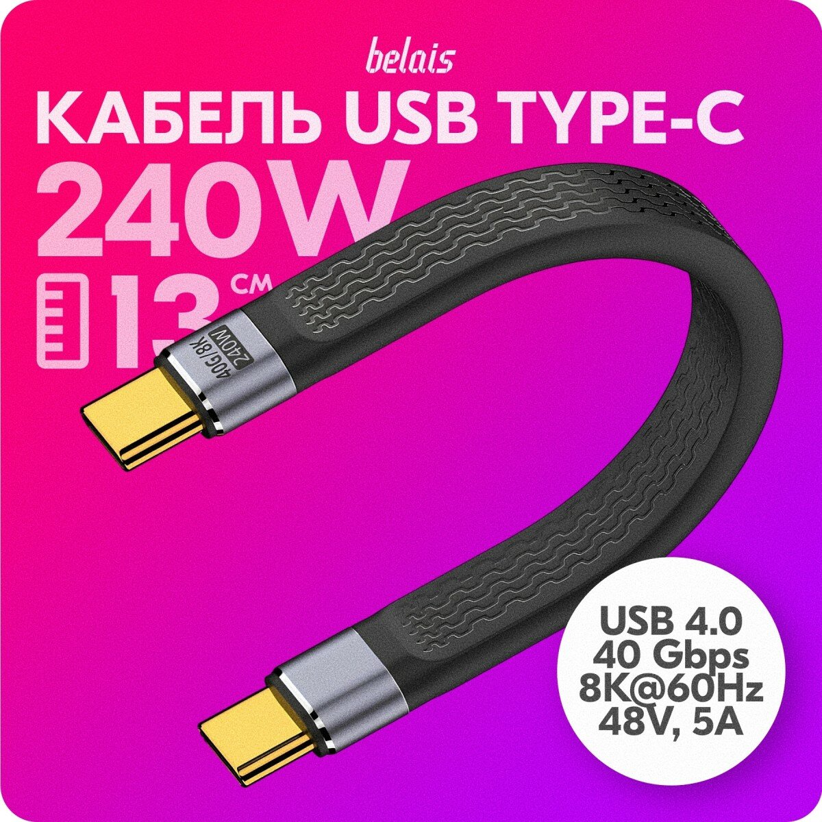 Кабель короткий сверхскоростной TYPE-C Thunderbolt «belais» (40 Gbps, 240W, 8K@60Hz, 48V, 5A, USB 4.0, 13 см, чёрный) belais #22640 информация: