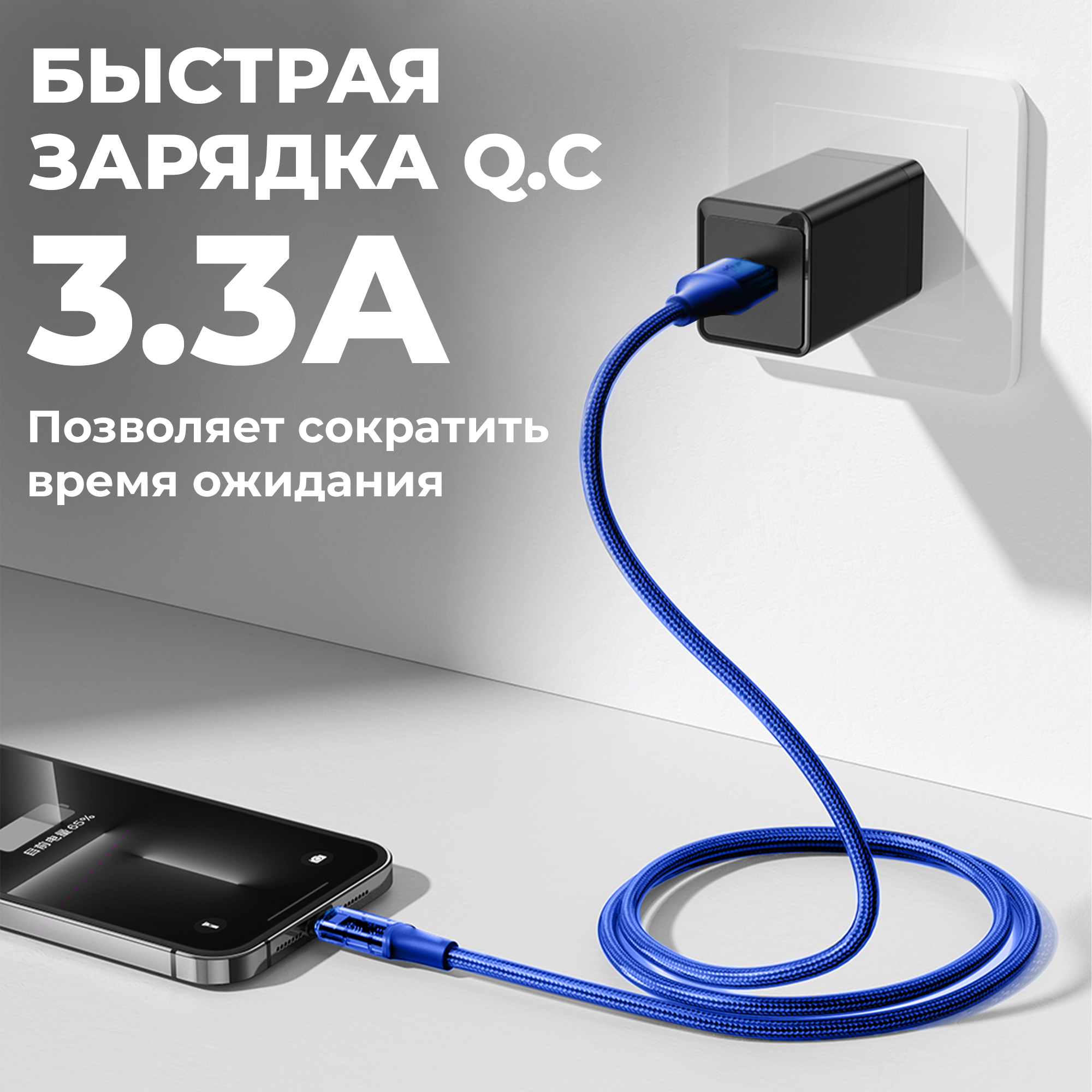 10 цен на Кабель USB TypeC, 3.1А, 1м, быстрая зарядка и передача данных для телефона тайп си, провод для айфона, переходник, синий