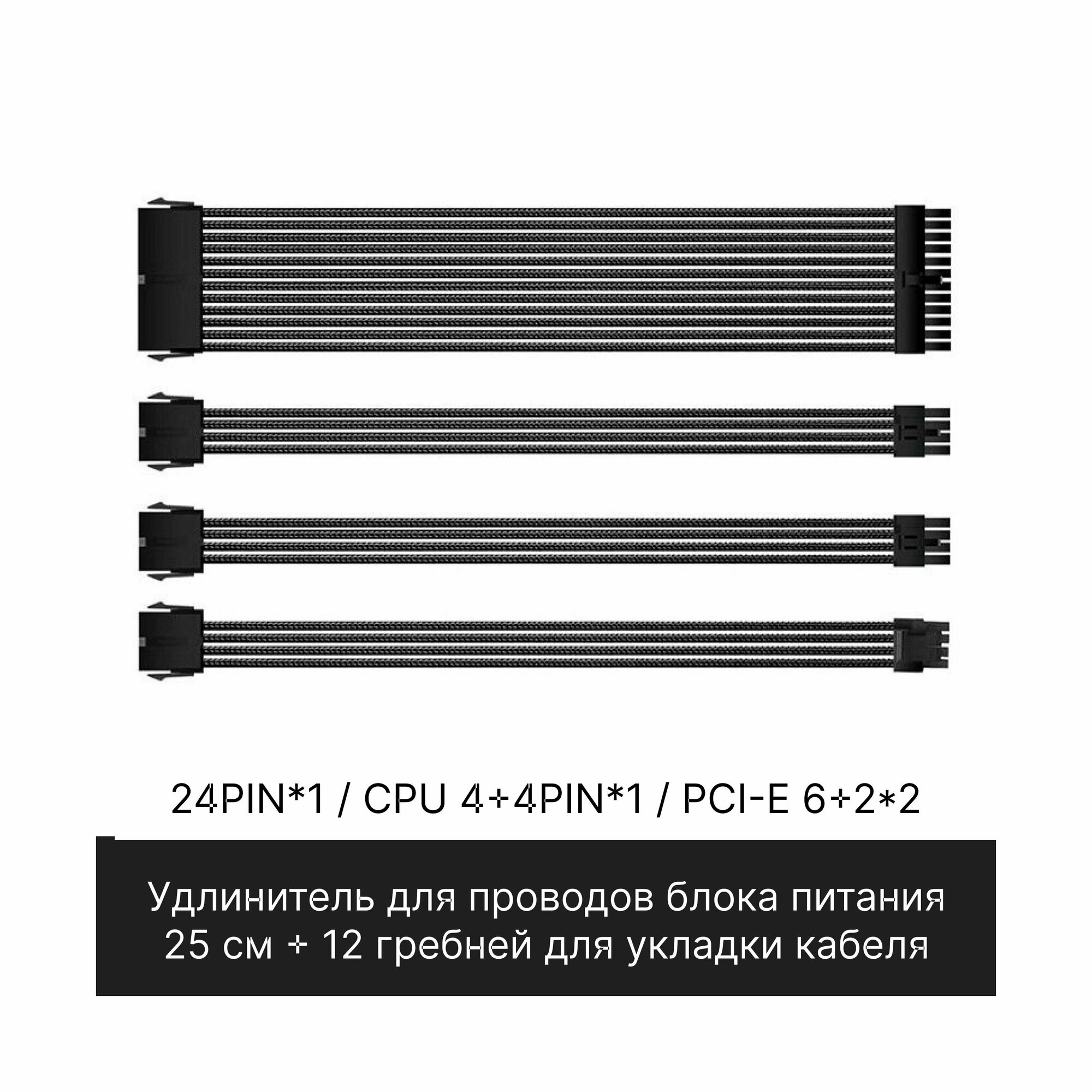 Комплект кастомных удлинителей для блока питания 25 см черный 24 Pin, 4+4 pin, 6+2x2 PCI-E c гребенками информация: