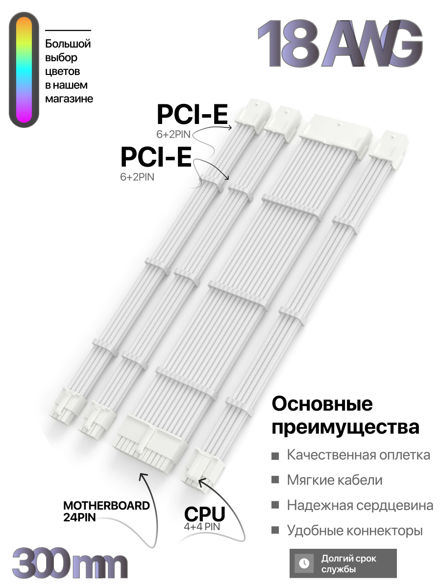 Отзывы на Комплект кастомных удлинителей для блока питания 30 см белые провода, белые коннекторы 24 Pin