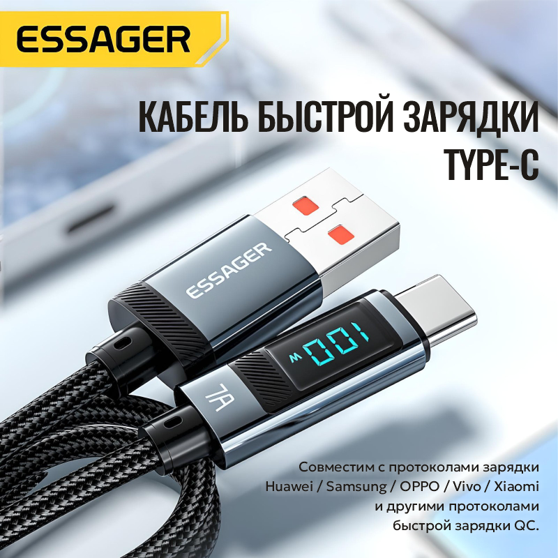Отзывы на Кабель USB-Type-C для быстрой зарядки и передачи данных Essager с измерителем силы тока (E-mark чип), макс 100 Вт, 7 А, 480 Мбит/с, 2 м (Синий)