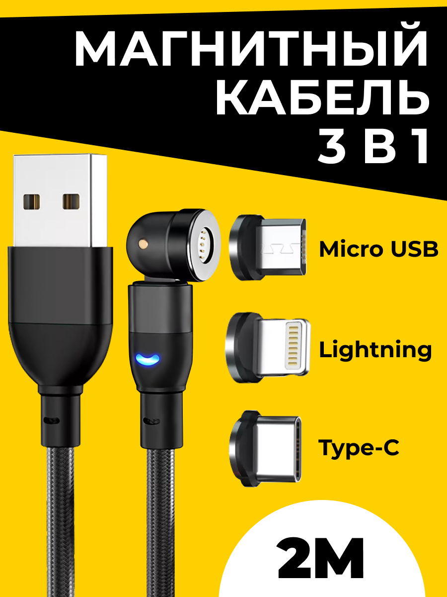 USB зарядка 3 в 1 / Micro, Type-C, Lightning / Магнитный кабель 3в1 / Микро юсб, Тайп-С, Лайтнинг / Вращающийся на 540 градусов провод 2м / Черный информация: