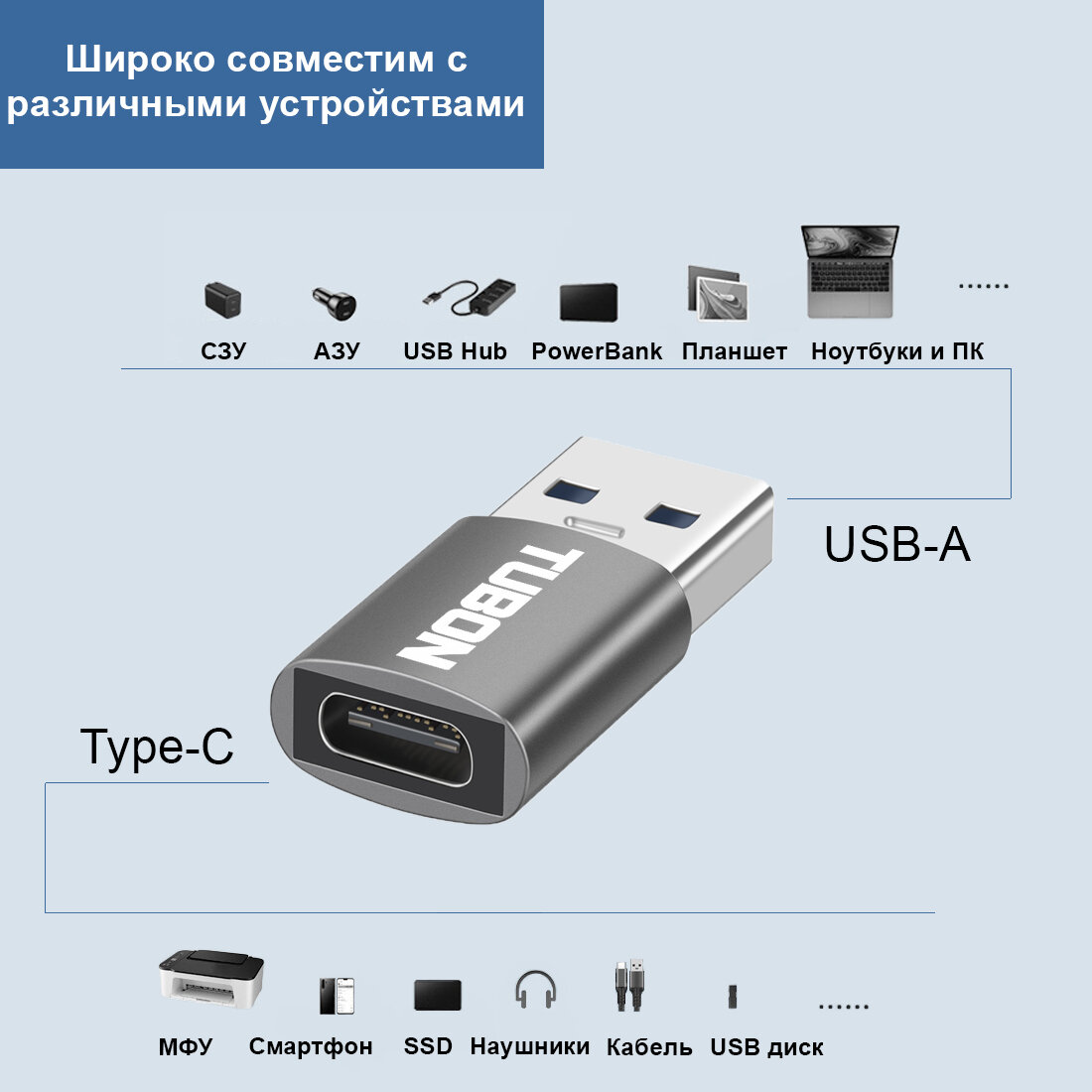 Переходник адаптер OTG TUBON USB3.2 USB - Type-C 10Gbps/480Mbps 60W AUS02 Серый информация: