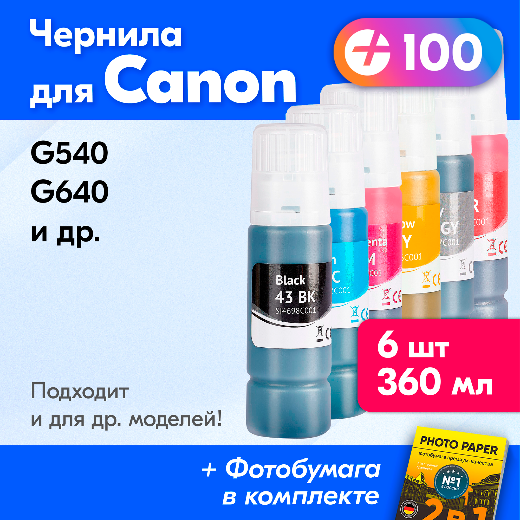 10 цен на Чернила к Canon GI-43, Canon PIXMA G540 G640 и др. Краска для принтера Кенон для заправки картриджей (Комплект 6 шт)