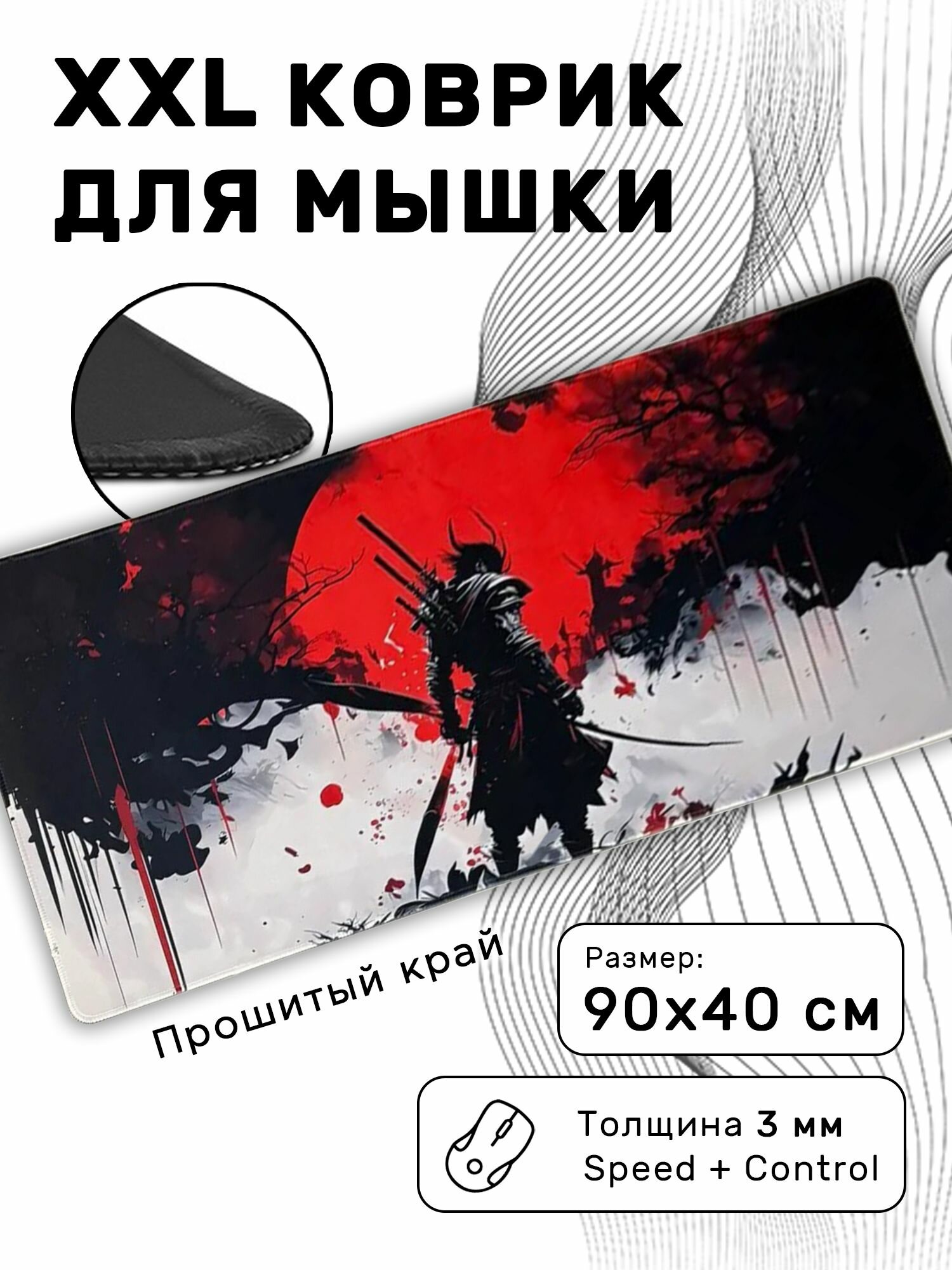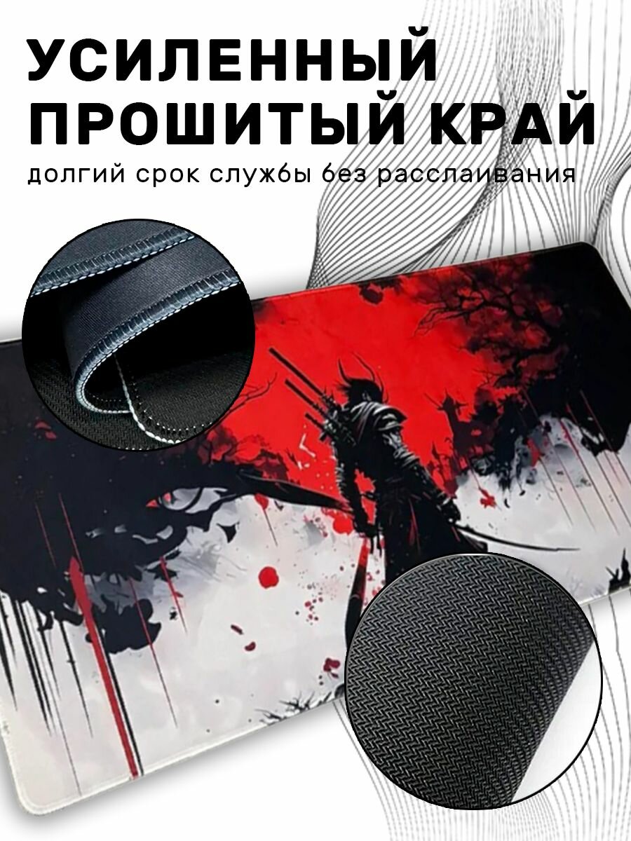 Отзывы на Большой игровой коврик в японском стиле для мышки и клавиатуры 90х40 см, самурай с катаной на фоне красной луны