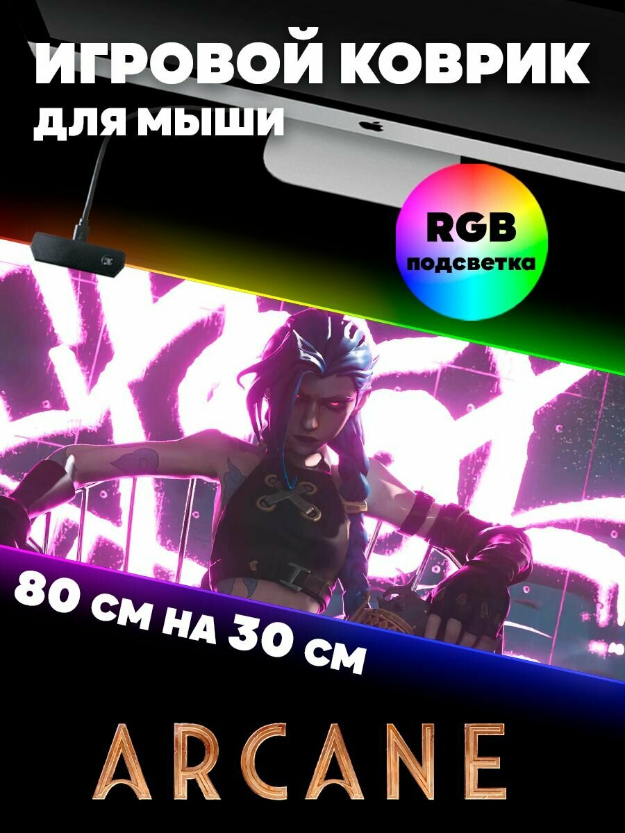 Игровой коврик для мыши с RGB подсветкой 80 см х 30 см х 4 мм Аркейн, большой светящийся компьютерный коврик на стол League of Legends информация: