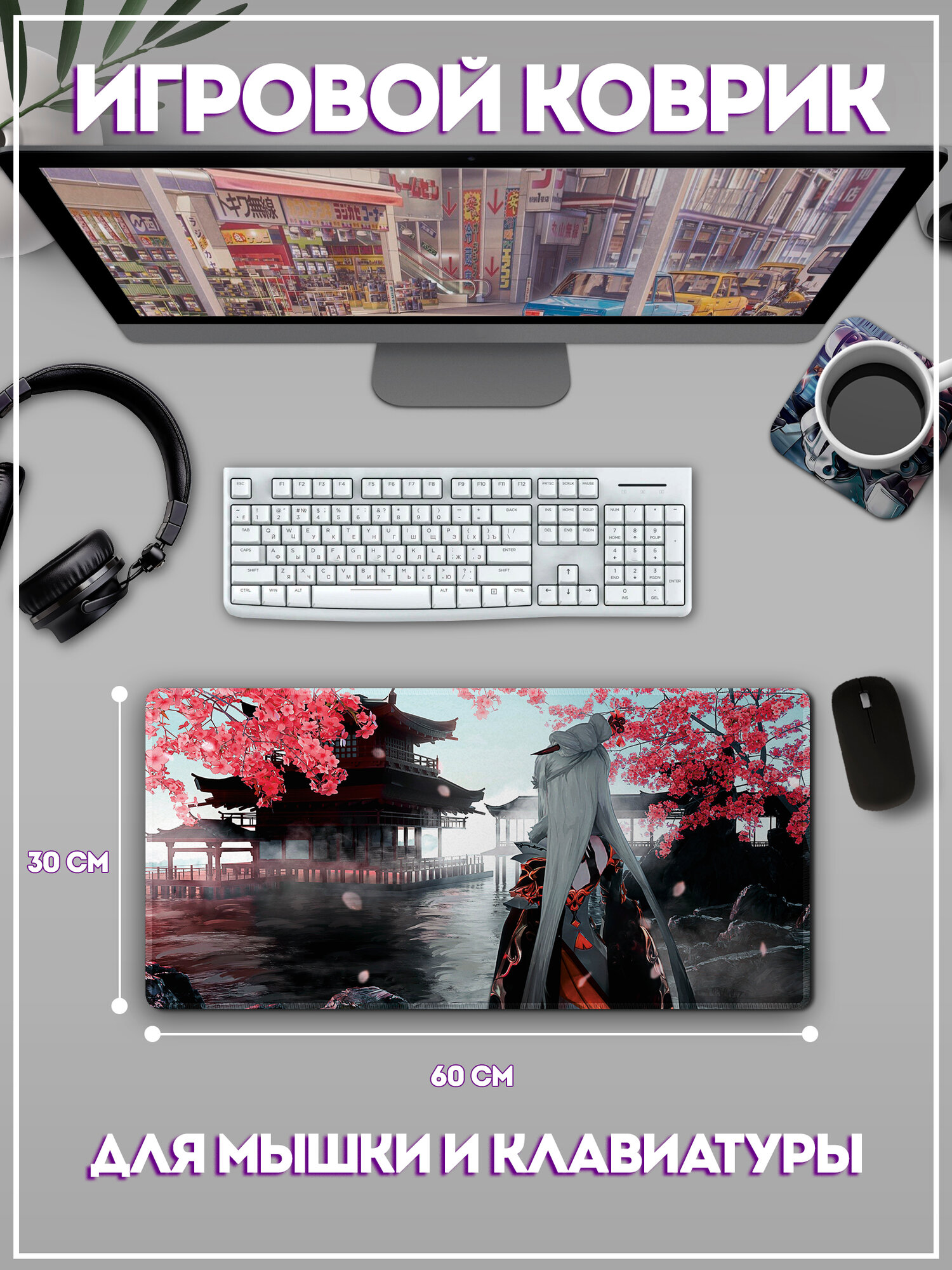 Коврик для мыши и клавиатуры "Аниме, цветение сакуры" на весь стол, большой размер, 60х30 см 1 519 ₽