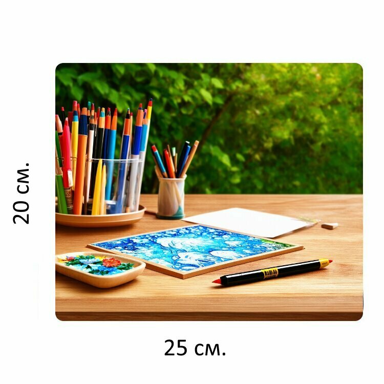 Отзывы на Коврик для мыши с принтом "Коричневый деревянный стол с инструментариями для рисования на фоне природы" 25x20см.