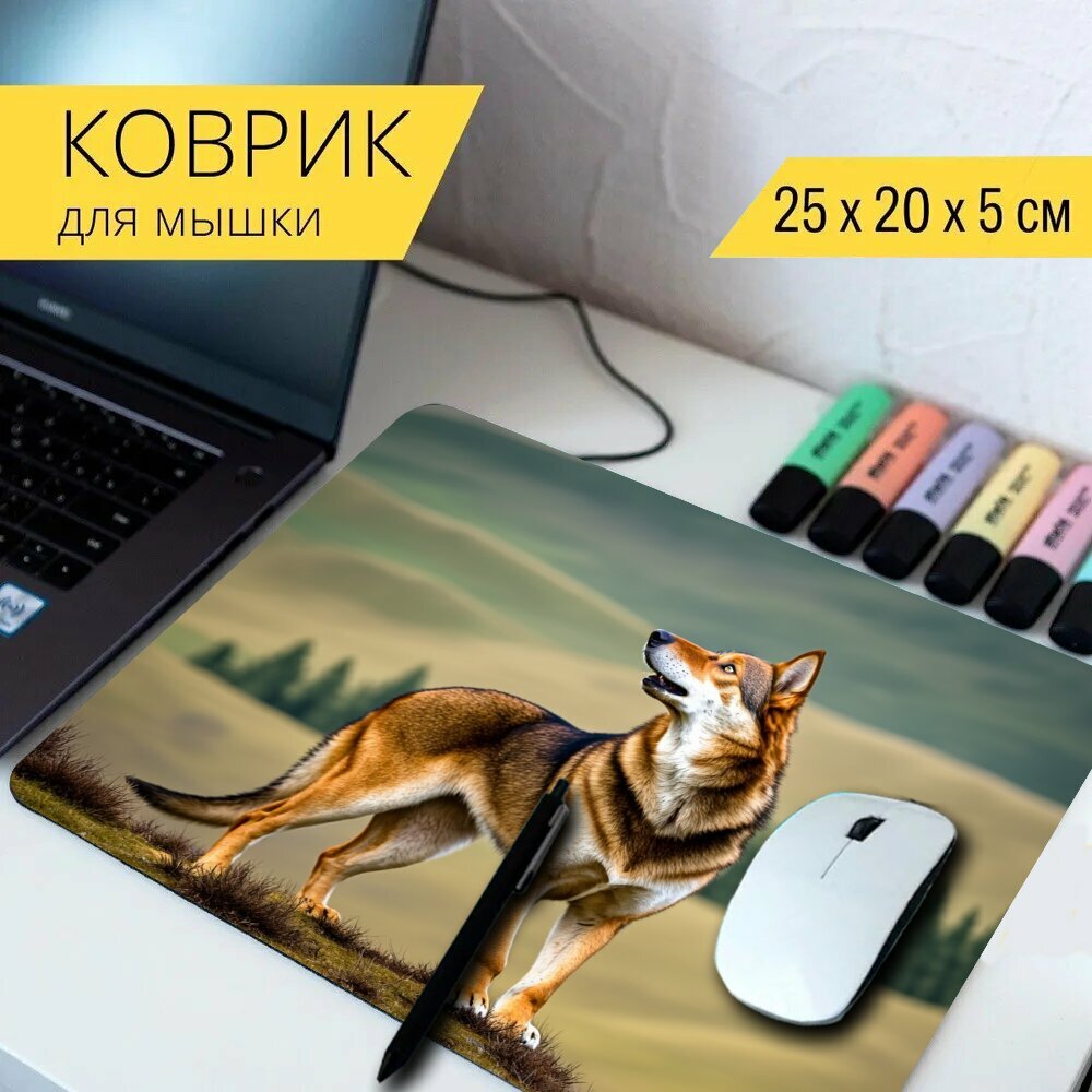 Коврик для мыши с принтом "Коричневый волк, стоящий на вершине холма и завывающий" 25x20см. информация: