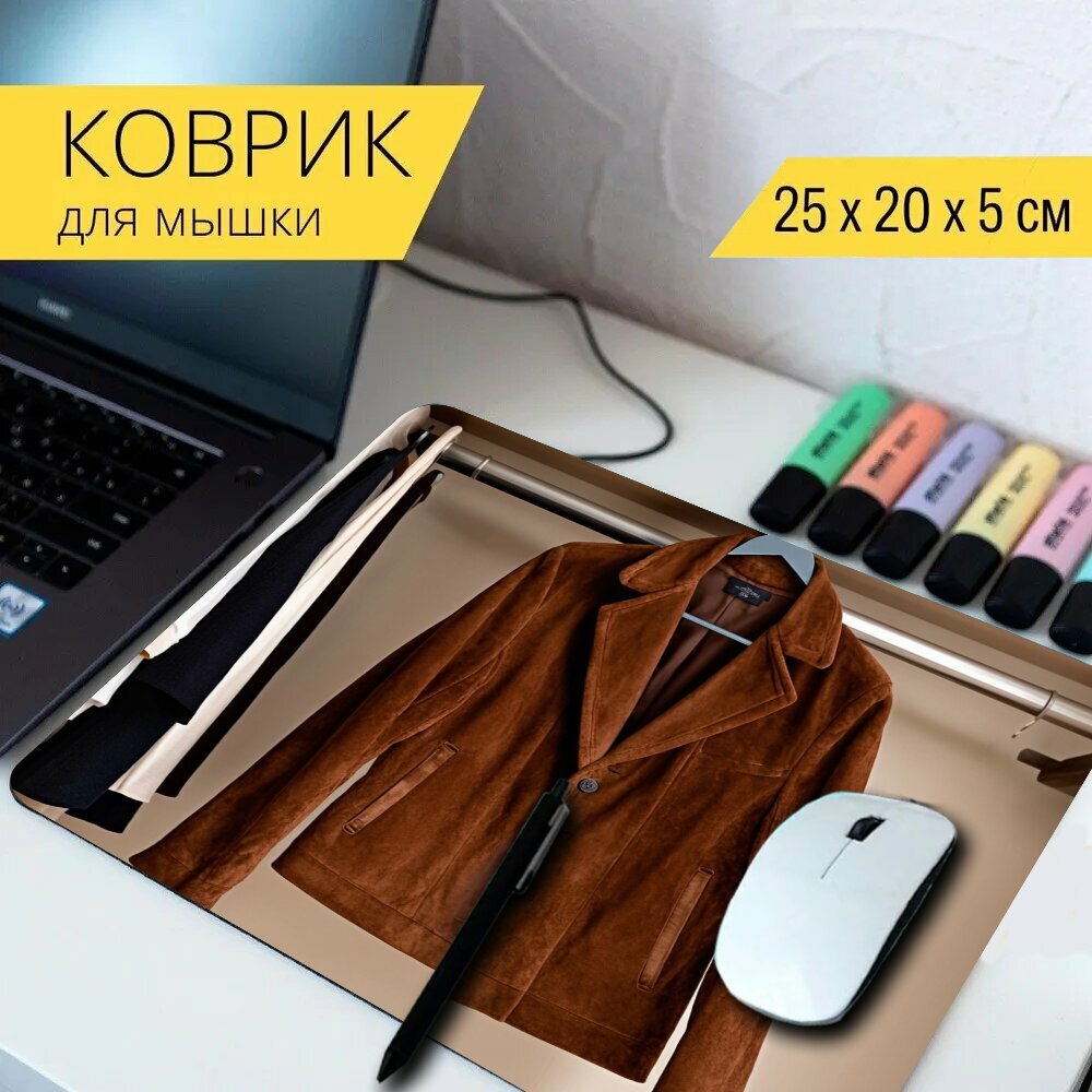 Коврик для мыши с принтом "Коричневая замшевая куртка, висящая на вешалке в гардеробной" 25x20см. информация: