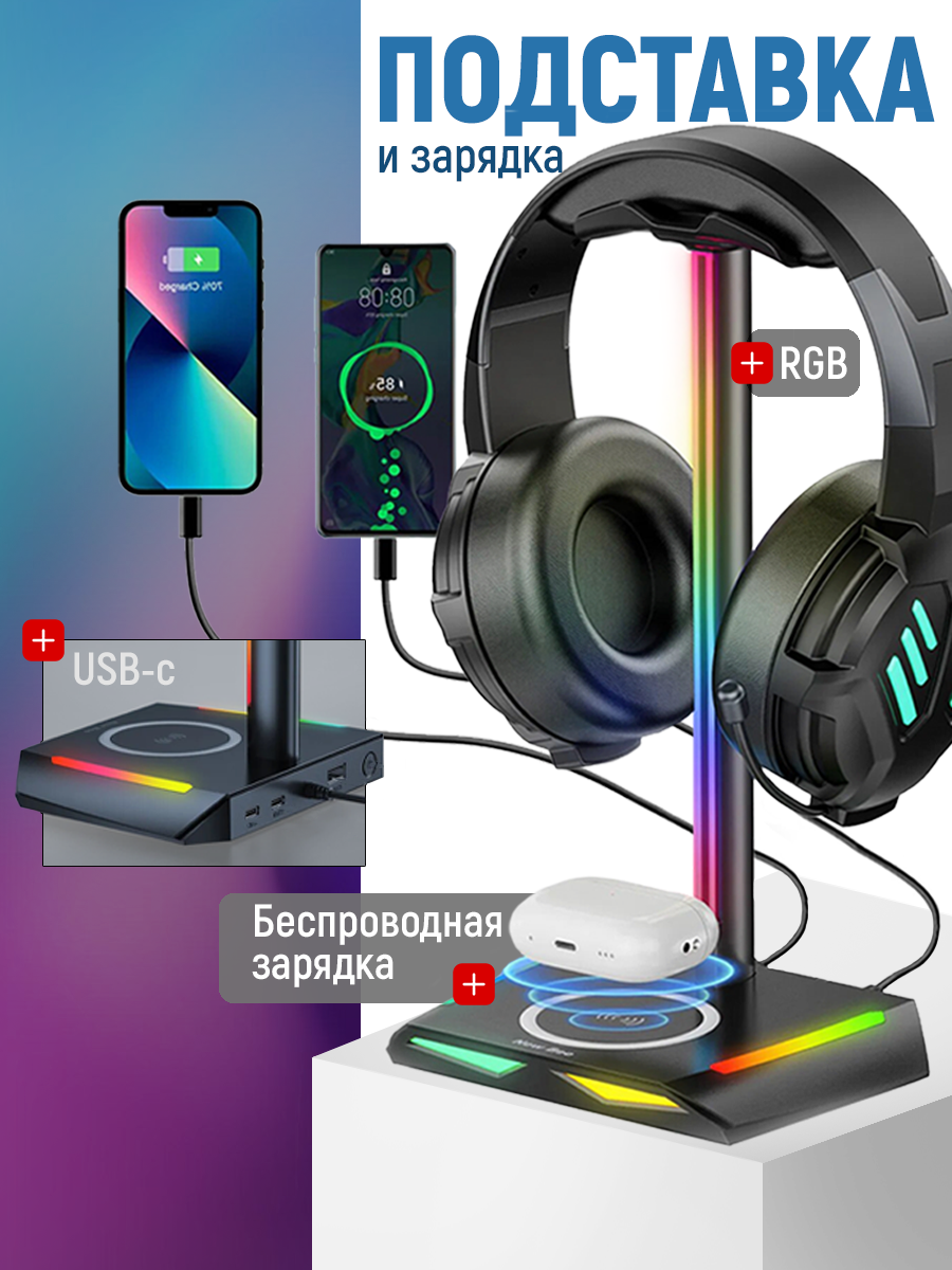 Подставка для игровых наушников с RGB подсветкой и USB портами / держатель для PC гарнитуры информация: