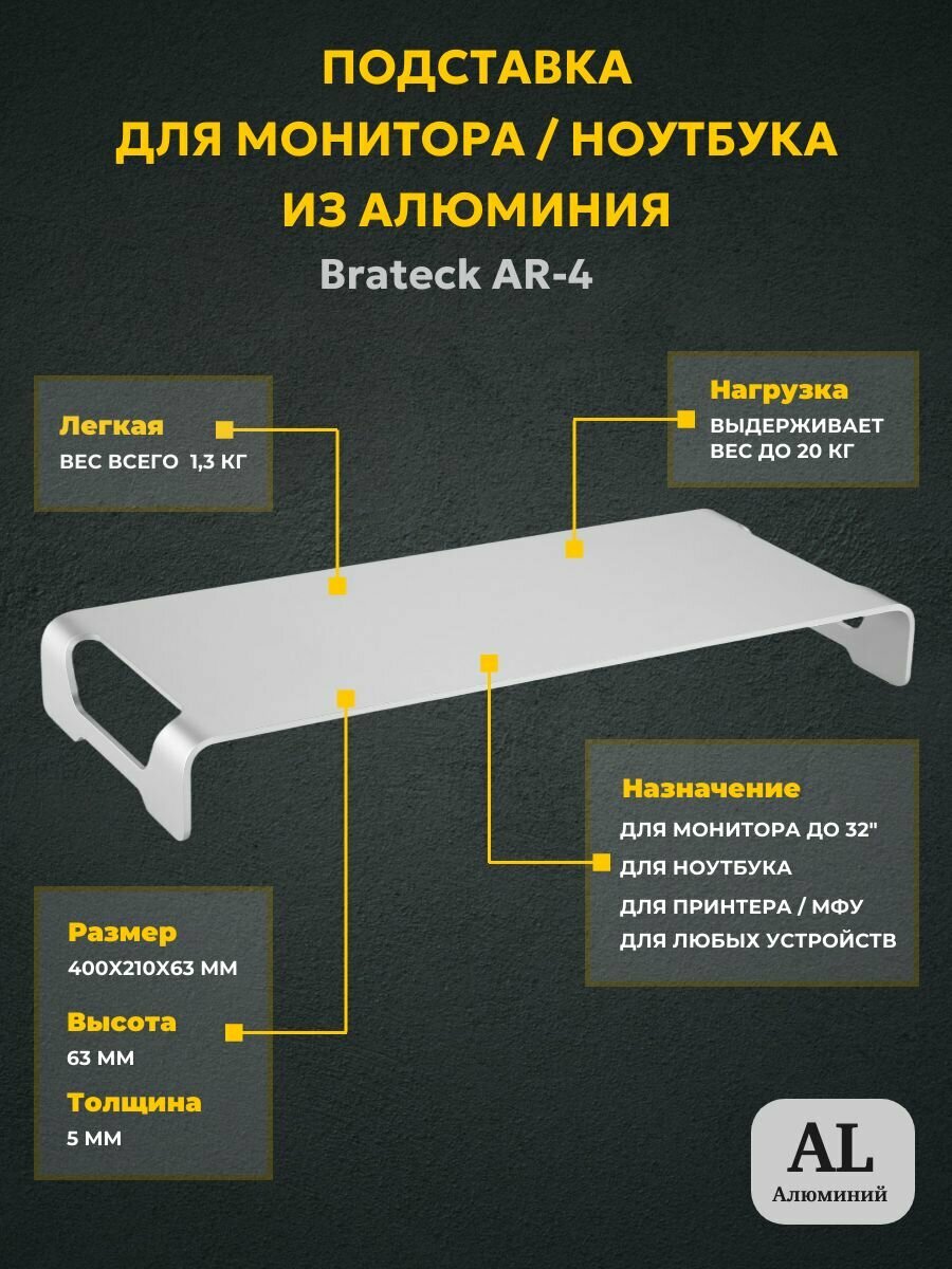 Подставка для монитора, для ноутбука, для моноблока из алюминия Brateck AR-4 (40x21см) информация: