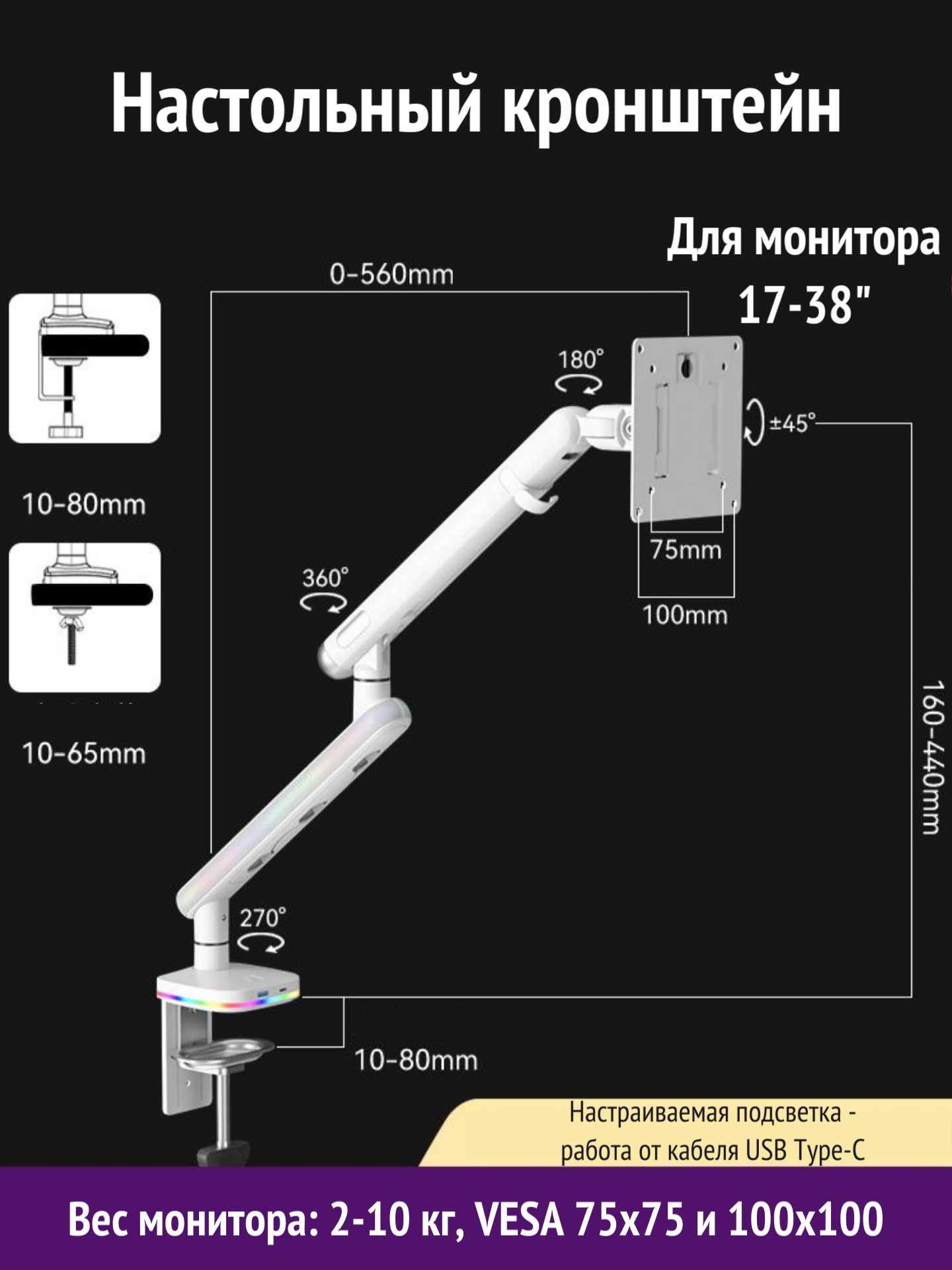 Настольный кронштейн для монитора Smart Monitor A8U-W, 17-38" до 10 кг, белый, с RGB-подсветкой информация: